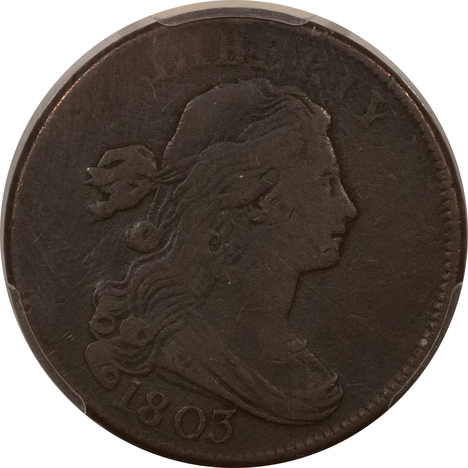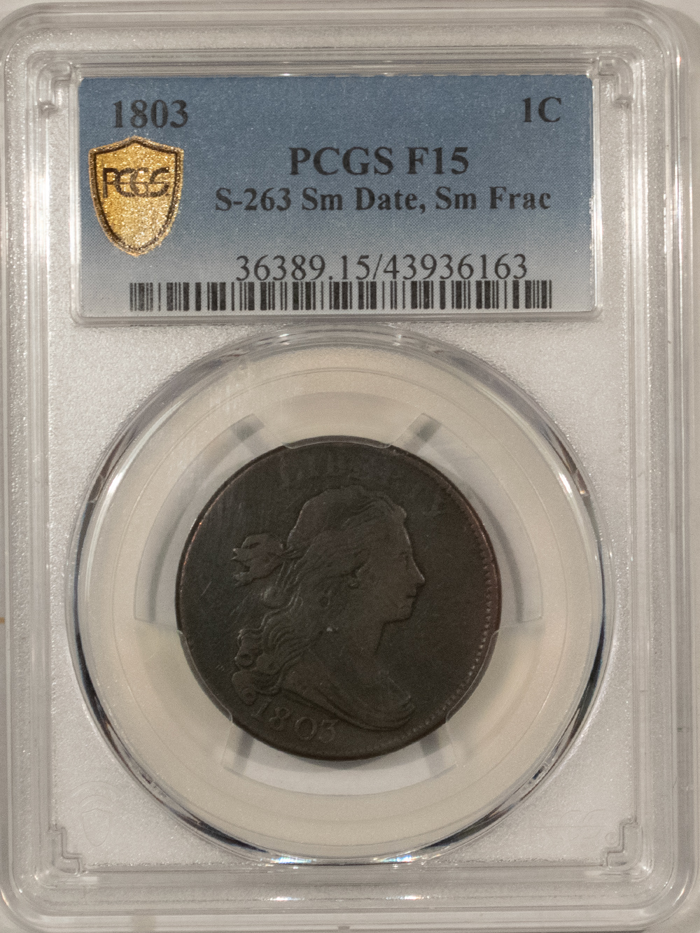 This is a 1803 DRAPED BUST LARGE CENT, S-263 SM DATE SM FRAC – PCGS F-15, NICE SMOOTH! Our commitment is to provide you with quality coins and collectibles at the best possible prices. This piece is no exception. Please note, the coin and collectibles markets do fluctuate, and prices occasionally will change. In this rare circumstance, we will contact you first to verify your order.