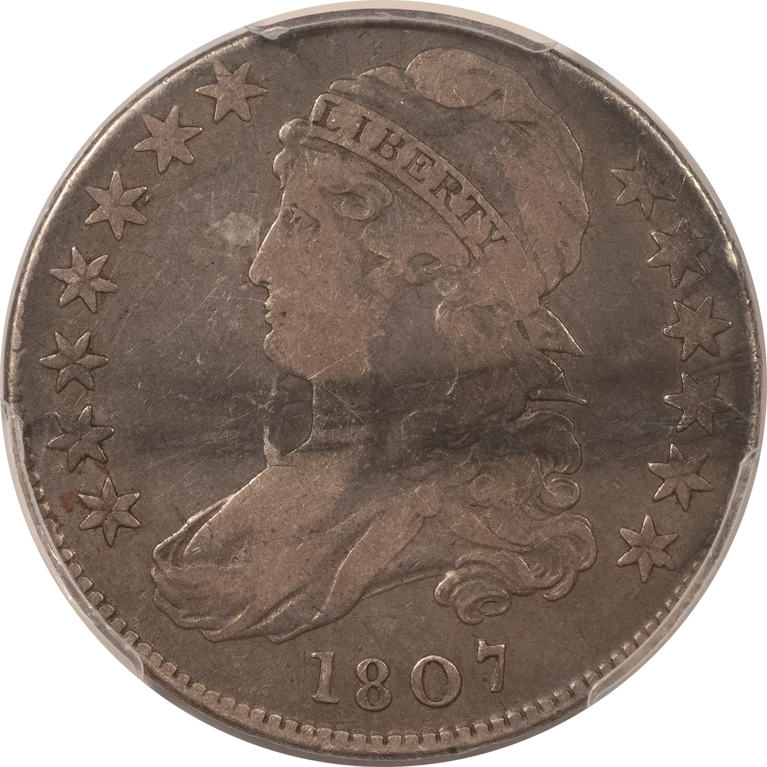 This is a 1807 CAPPED BUST HALF DOLLAR, BEARDED GODDESS – PCGS FINE DET STAINED BOLD CRACK! A popular and very rare variety. This one has an old rubber band stain, but is otherwise fairly decent. A bold crack at the chin! An affordable example of a variety that quickly exceeds five figures! Our commitment is to provide you with quality coins and collectibles at the best possible prices. This piece is no exception. Please note, the coin and collectibles markets do fluctuate, and prices occasionally will change. In this rare circumstance, we will contact you first to verify your order.