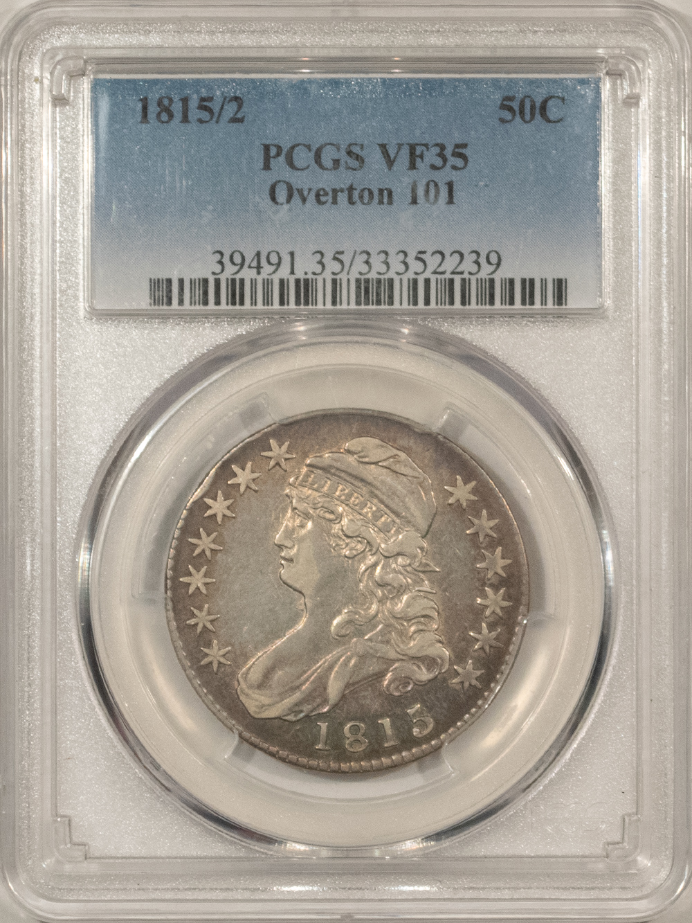 This is a 1815/2 CAPPED BUST HALF DOLLAR, O-101 – PCGS VF-35, KEY-DATE! Our commitment is to provide you with quality coins and collectibles at the best possible prices. This piece is no exception. Please note, the coin and collectibles markets do fluctuate, and prices occasionally will change. In this rare circumstance, we will contact you first to verify your order.