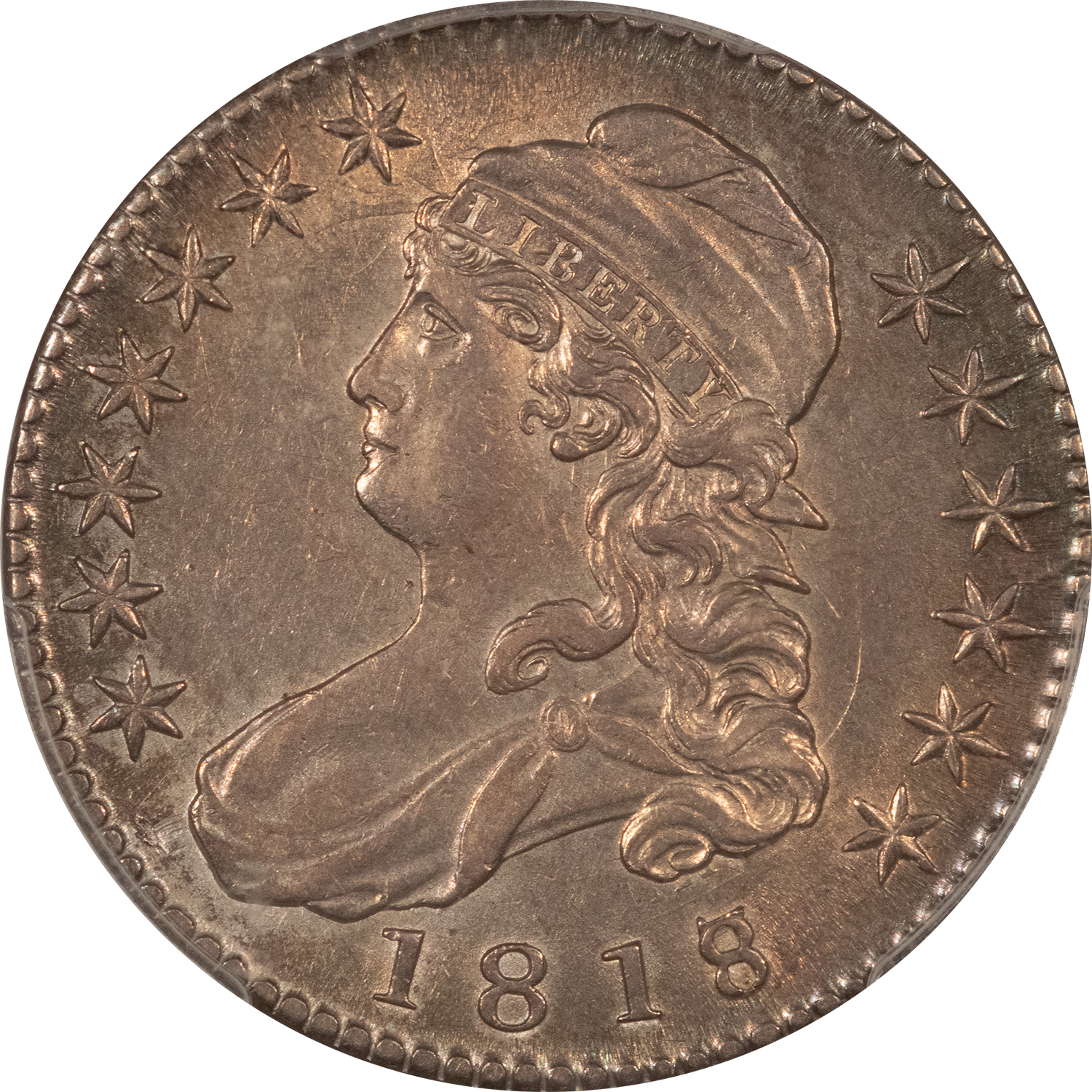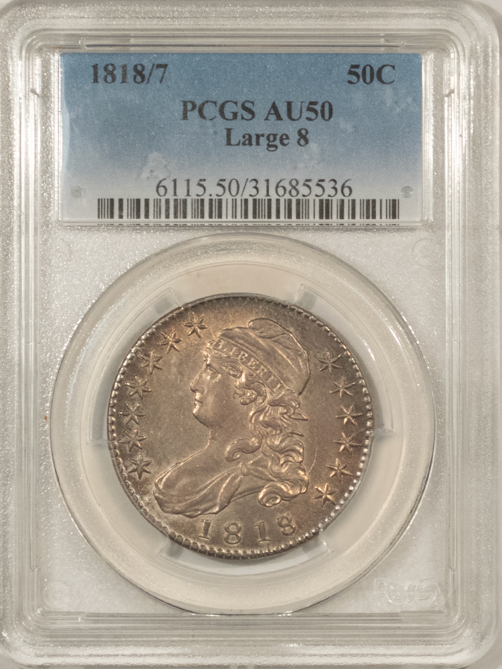This is a 1818/7 CAPPED BUST HALF DOLLAR, LARGE 8 – PCGS AU-50, HIGH GRADE & ATTRACTIVE! Our commitment is to provide you with quality coins and collectibles at the best possible prices. This piece is no exception. Please note, the coin and collectibles markets do fluctuate, and prices occasionally will change. In this rare circumstance, we will contact you first to verify your order.