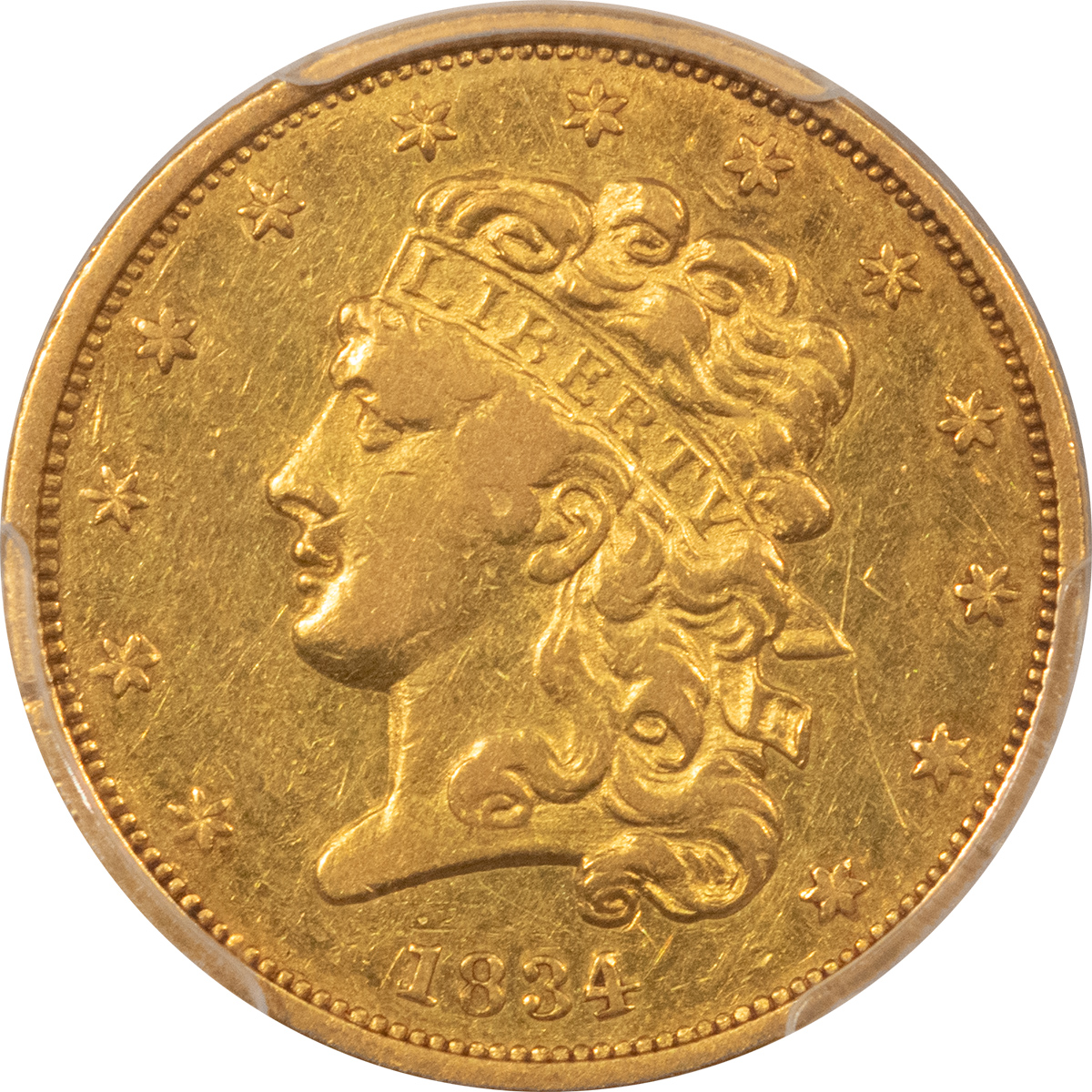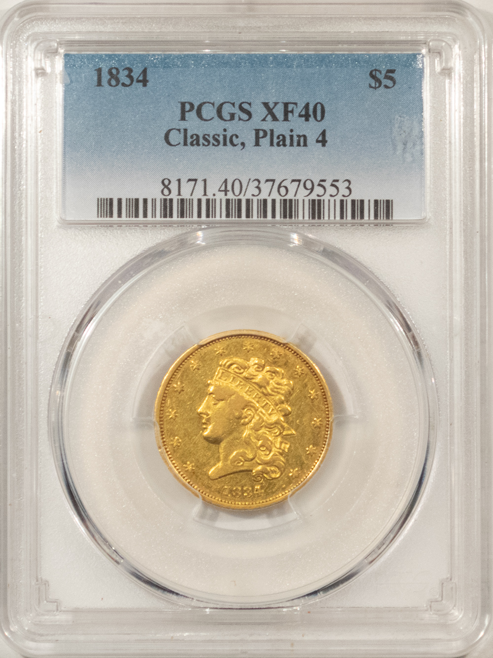 This is a 1834 $5 CLASSIC GOLD HALF EAGLE, PLAIN 4 – PCGS XF-40. Our commitment is to provide you with quality coins and collectibles at the best possible prices. This piece is no exception. Please note, the coin and collectibles markets do fluctuate, and prices occasionally will change. In this rare circumstance, we will contact you first to verify your order.