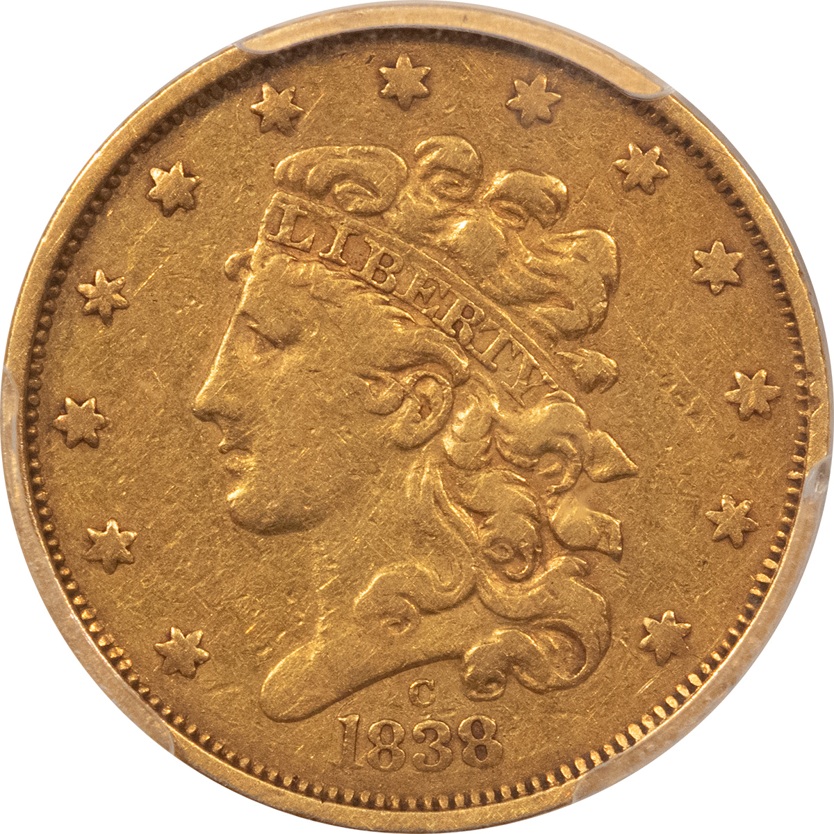 This is a 1838-C $5 CLASSIC HEAD GOLD HALF EAGLE PCGS VF-25, RARE, DESIRABLE 1ST YR CHARLOTTE! A low, original mintage of just 17,179 pieces, nearly all of which saw extensive circulation. Only about 175 total pieces are believed to exist, most of which are cleaned or damaged. This Charlotte piece, with the prominent first-year obverse C mintmark, has strong detail and faces up quite nicely for the assigned grade. Most of these are $20,000+, making this example a pleasing, yet rare coin at a reasonable price point. Our commitment is to provide you with quality coins and collectibles at the best possible prices. This piece is no exception. Please note, the coin and collectibles markets do fluctuate, and prices occasionally will change. In this rare circumstance, we will contact you first to verify your order.