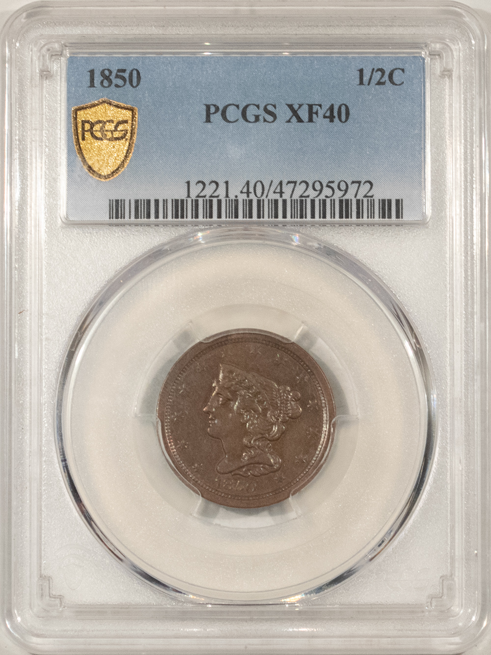 This is a 1850 BRAIDED HAIR HALF CENT – PCGS XF-40, TOUGH DATE! Our commitment is to provide you with quality coins and collectibles at the best possible prices. This piece is no exception. Please note, the coin and collectibles markets do fluctuate, and prices occasionally will change. In this rare circumstance, we will contact you first to verify your order.