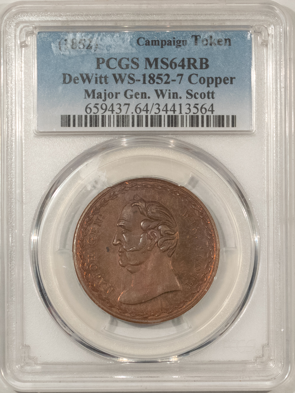 This is a 1852 MAJOR GENERAL WINFIELD SCOTT CAMPAIGN TOKEN, DEWITT WS-1852-7, PCGS MS-64RB! THIS IS A RARE TOKEN, AND ESPECIALLY SO IN THIS HIGH GRADE! Our commitment is to provide you with quality coins and collectibles at the best possible prices. This piece is no exception. Please note, the coin and collectibles markets do fluctuate, and prices occasionally will change. In this rare circumstance, we will contact you first to verify your order.