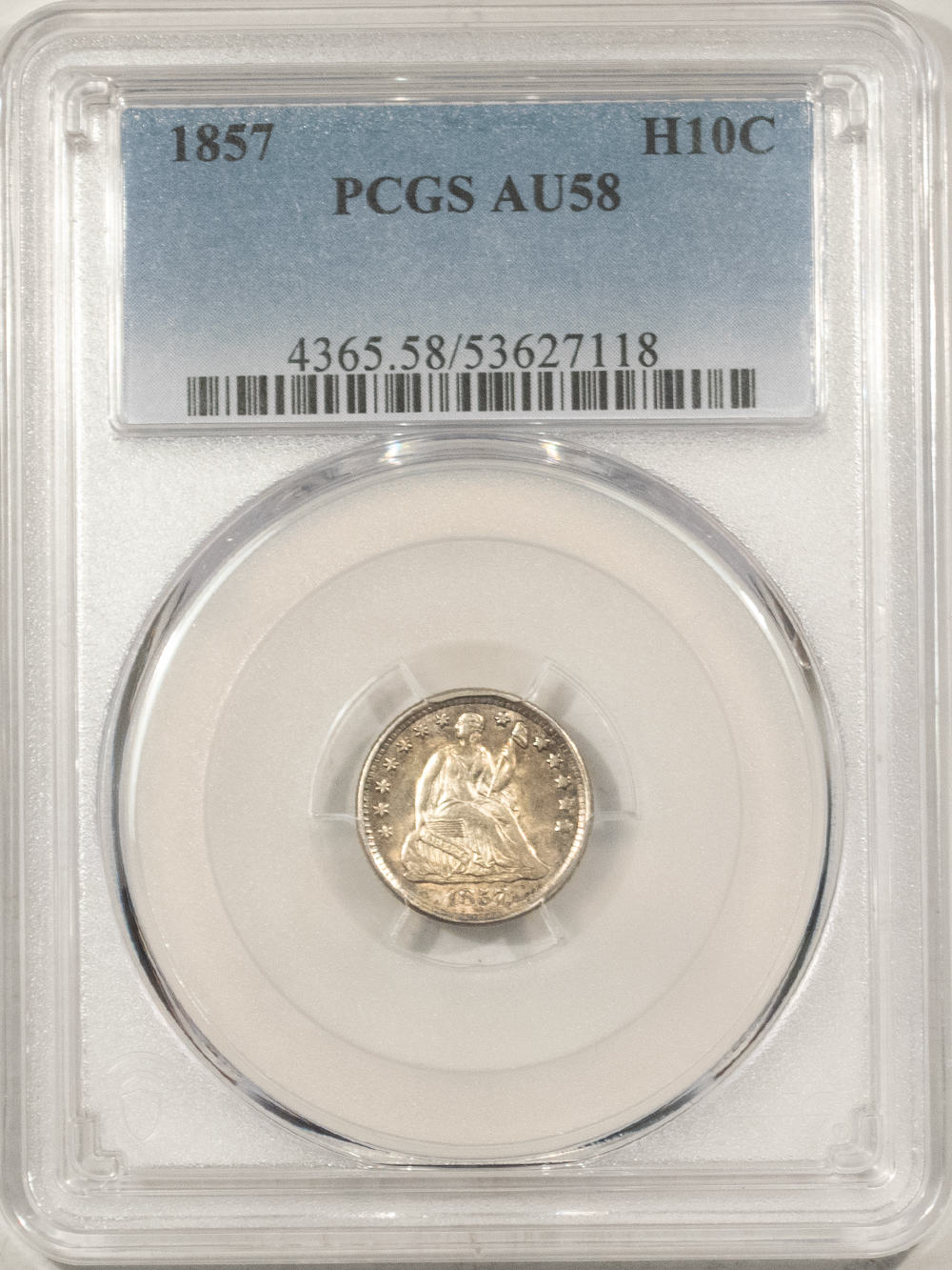 This is a 1857 SEATED LIBERTY HALF DIME – PCGS AU-58, PRETTY! Our commitment is to provide you with quality coins and collectibles at the best possible prices. This piece is no exception. Please note, the coin and collectibles markets do fluctuate, and prices occasionally will change. In this rare circumstance, we will contact you first to verify your order.