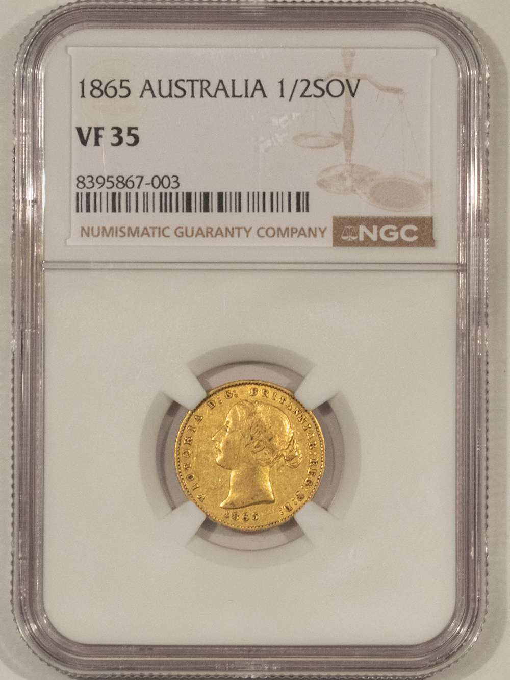 This is a 1865 AUSTRALIA 1/2 GOLD SOVEREIGN, KM-3 – NGC VF-35, SCARCE! Our commitment is to provide you with quality coins and collectibles at the best possible prices. This piece is no exception. Please note, the coin and collectibles markets do fluctuate, and prices occasionally will change. In this rare circumstance, we will contact you first to verify your order.