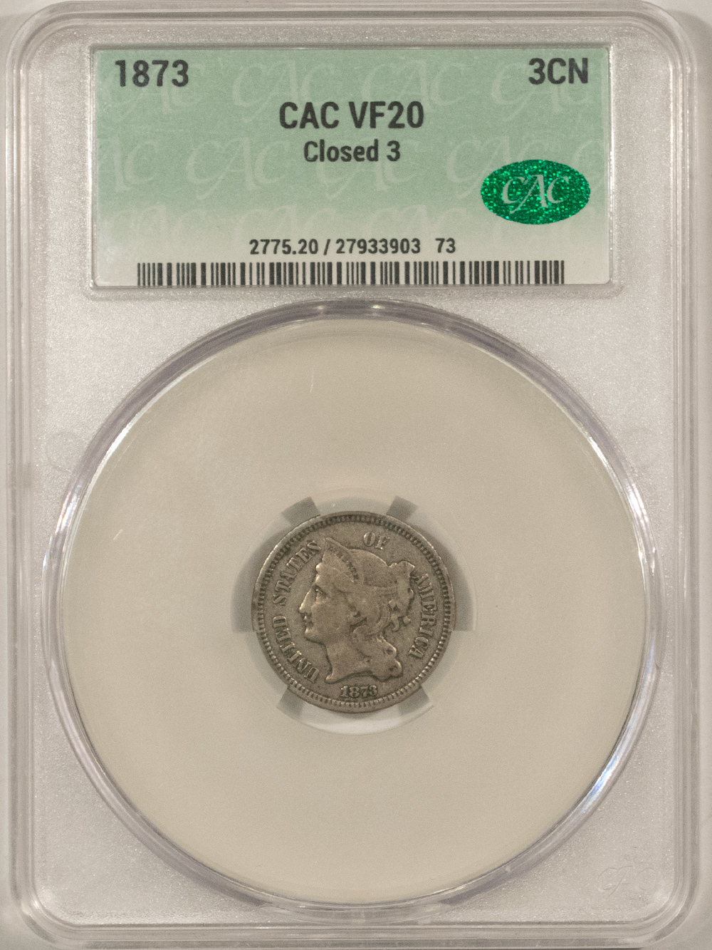 This is a 1873 THREE CENT NICKEL, CLOSED 3 – CACG VF-20, CAC APPROVED! Our commitment is to provide you with quality coins and collectibles at the best possible prices. This piece is no exception. Please note, the coin and collectibles markets do fluctuate, and prices occasionally will change. In this rare circumstance, we will contact you first to verify your order.