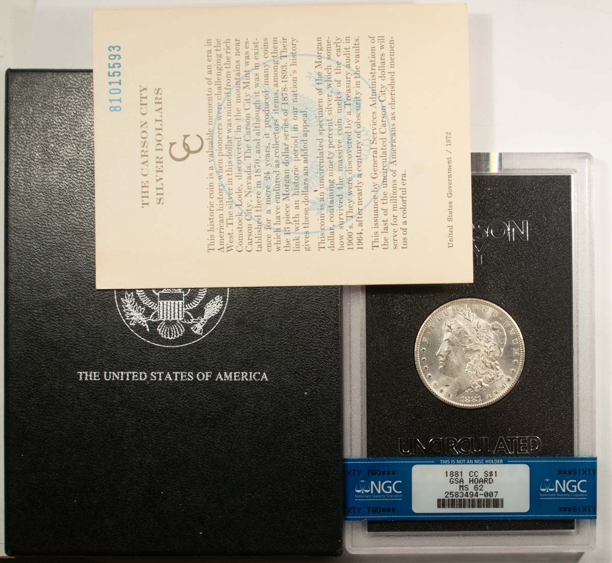 This is a 1881-CC MORGAN DOLLAR, GSA HARD CASE, NGC MS-62 W/ BOX & CERT-FROSTY WHITE! Our commitment is to provide you with quality coins and collectibles at the best possible prices. This piece is no exception. Please note, the coin and collectibles markets do fluctuate, and prices occasionally will change. In this rare circumstance, we will contact you first to verify your order.