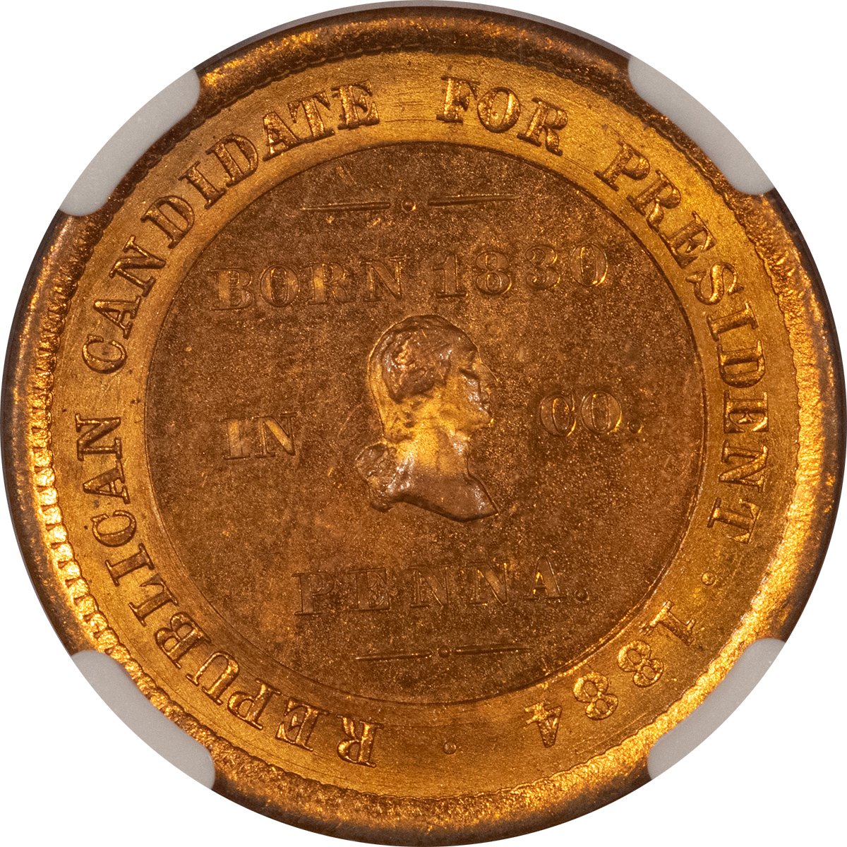 This is a 1884 JAMES BLAINE CAMPAIGN TOKEN, DEWITT JGB-1884-18, BRASS, EX-DEWITT-NGC MS-65. THIS IS QUITE POSSIBLY THE FINEST KNOW EXAMPLE OF THIS SCARCE TOKEN! Our commitment is to provide you with quality coins and collectibles at the best possible prices. This piece is no exception. Please note, the coin and collectibles markets do fluctuate, and prices occasionally will change. In this rare circumstance, we will contact you first to verify your order.