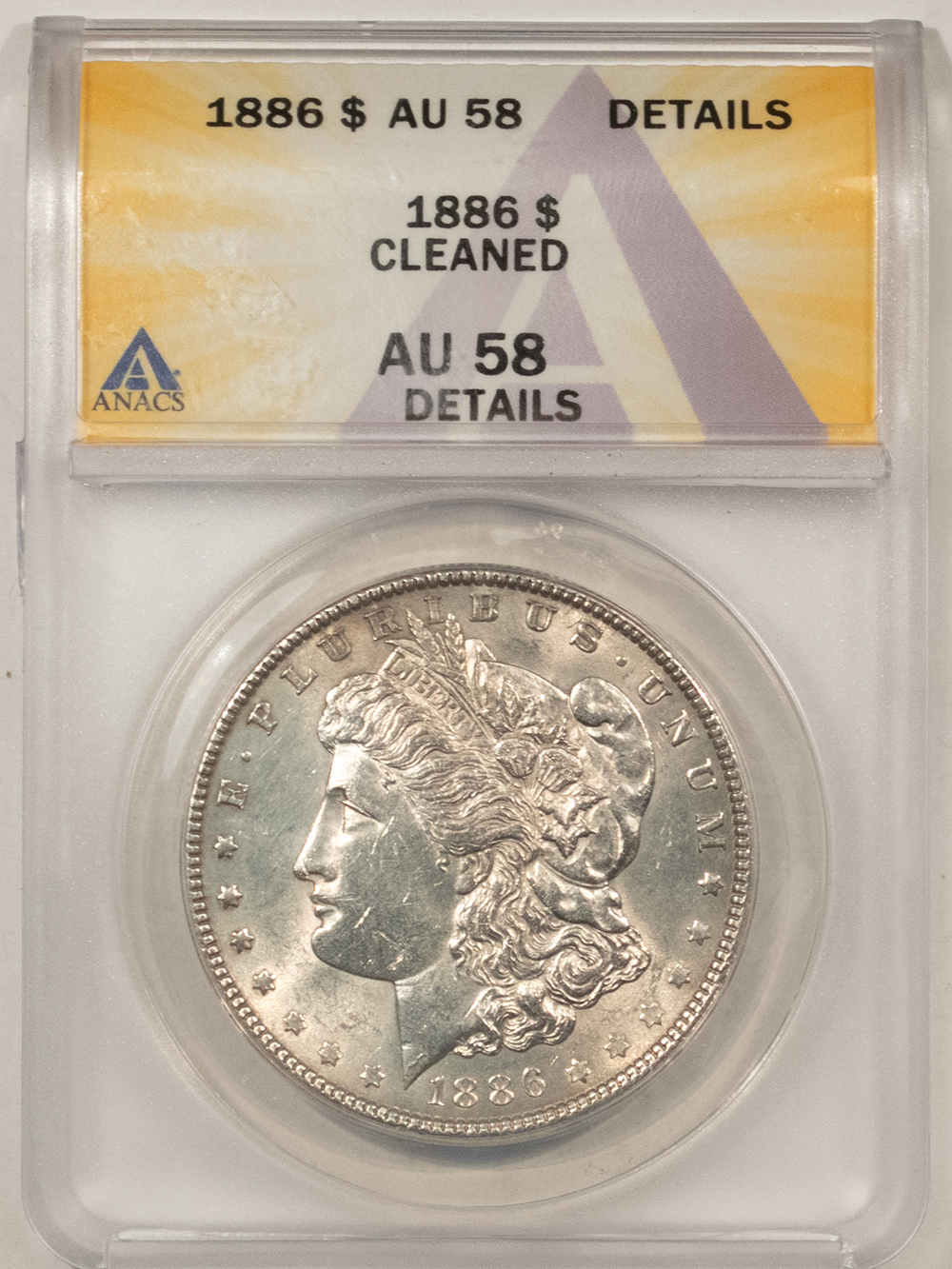 This is a 1886 $1 MORGAN DOLLAR – ANACS AU-58 DETAILS, CLEANED. Our commitment is to provide you with quality coins and collectibles at the best possible prices. This piece is no exception. Please note, the coin and collectibles markets do fluctuate, and prices occasionally will change. In this rare circumstance, we will contact you first to verify your order.
