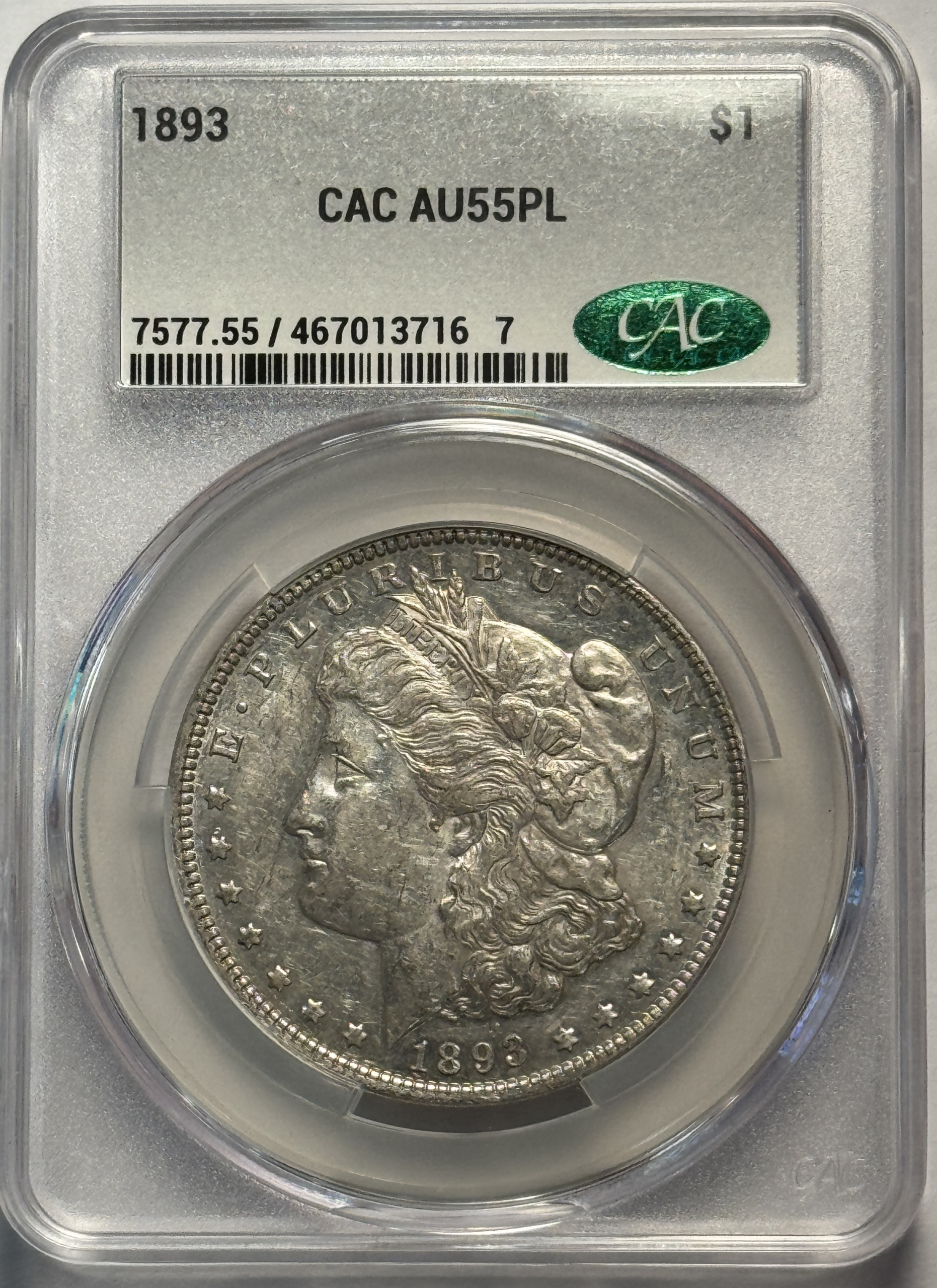 This is a 1893 MORGAN DOLLAR, CACGS AU-55 PL, FRESH W/ UNC APPEARANCE & REFLECTIVE FIELDS! Our commitment is to provide you with quality coins and collectibles at the best possible prices. This piece is no exception. Please note, the coin and collectibles markets do fluctuate, and prices occasionally will change. In this rare circumstance, we will contact you first to verify your order.