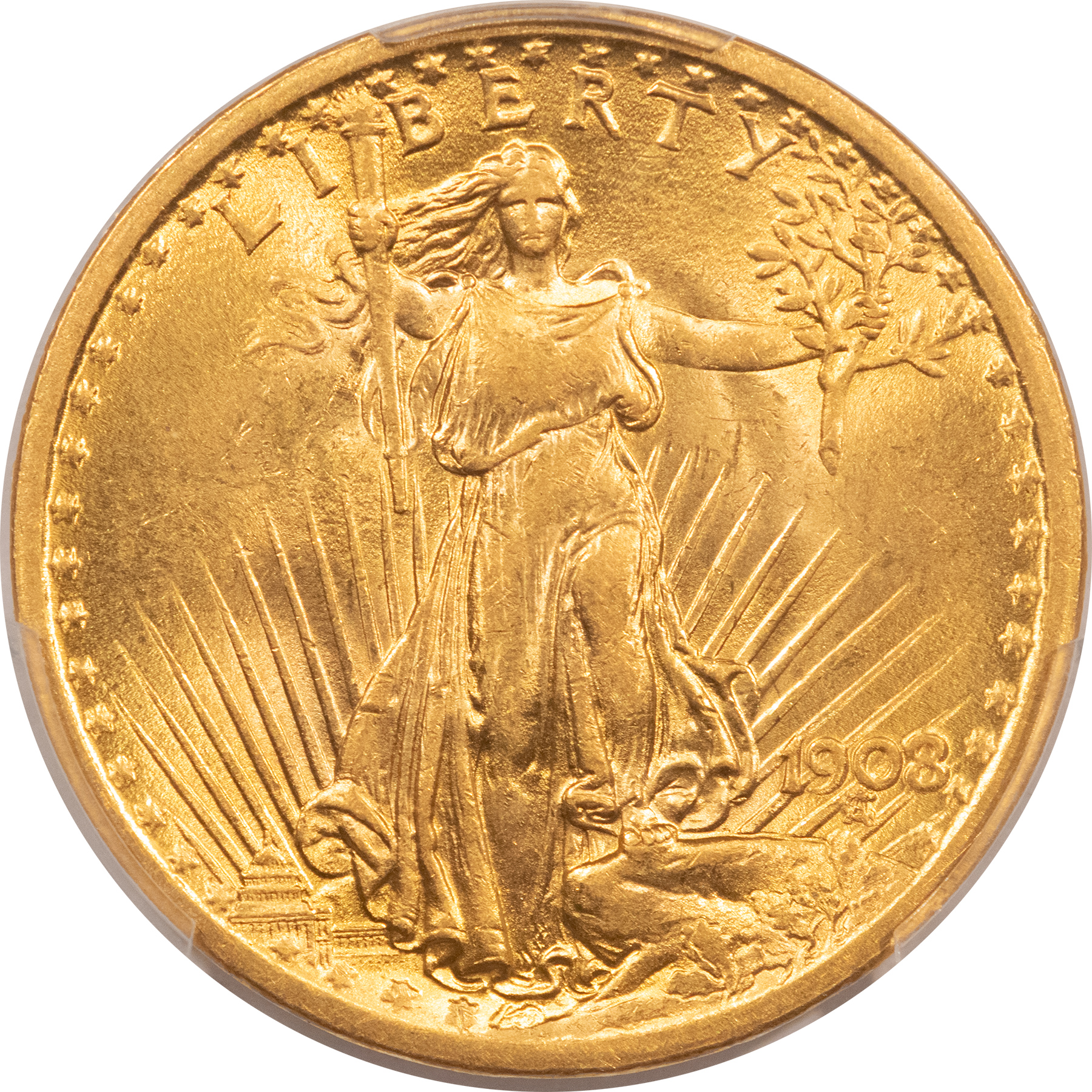 This is a 1908 $20 ST GAUDENS GOLD DOUBLE EAGLE, NO MOTTO – PCGS MS-62! Our commitment is to provide you with quality coins and collectibles at the best possible prices. This piece is no exception. Please note, the coin and collectibles markets do fluctuate, and prices occasionally will change. In this rare circumstance, we will contact you first to verify your order.