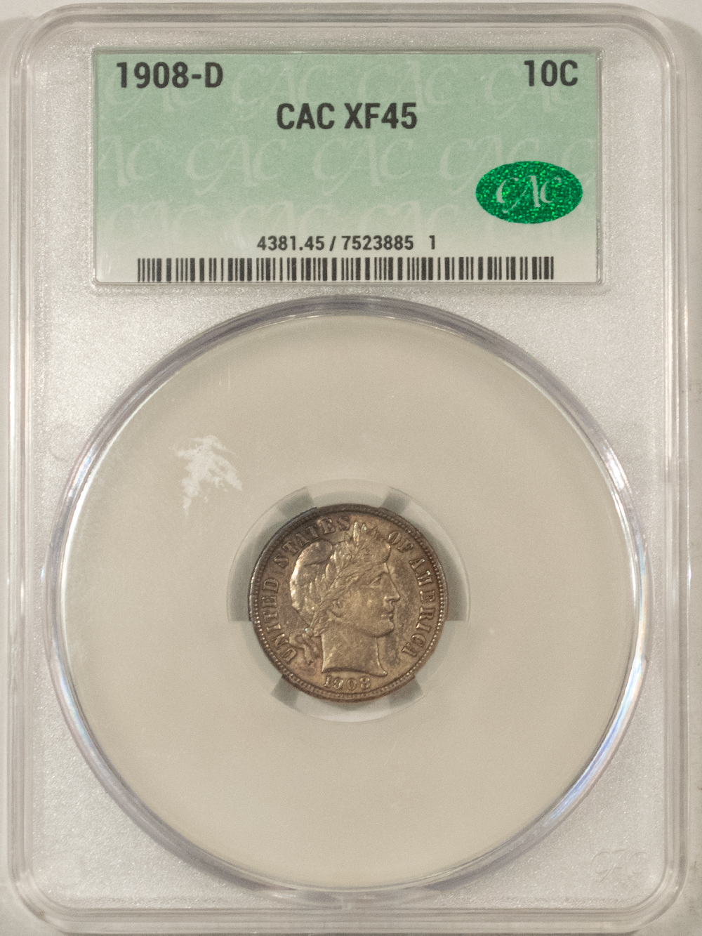 This is a 1908-D BARBER DIME – CACG XF-45, CAC APPROVED! Our commitment is to provide you with quality coins and collectibles at the best possible prices. This piece is no exception. Please note, the coin and collectibles markets do fluctuate, and prices occasionally will change. In this rare circumstance, we will contact you first to verify your order.