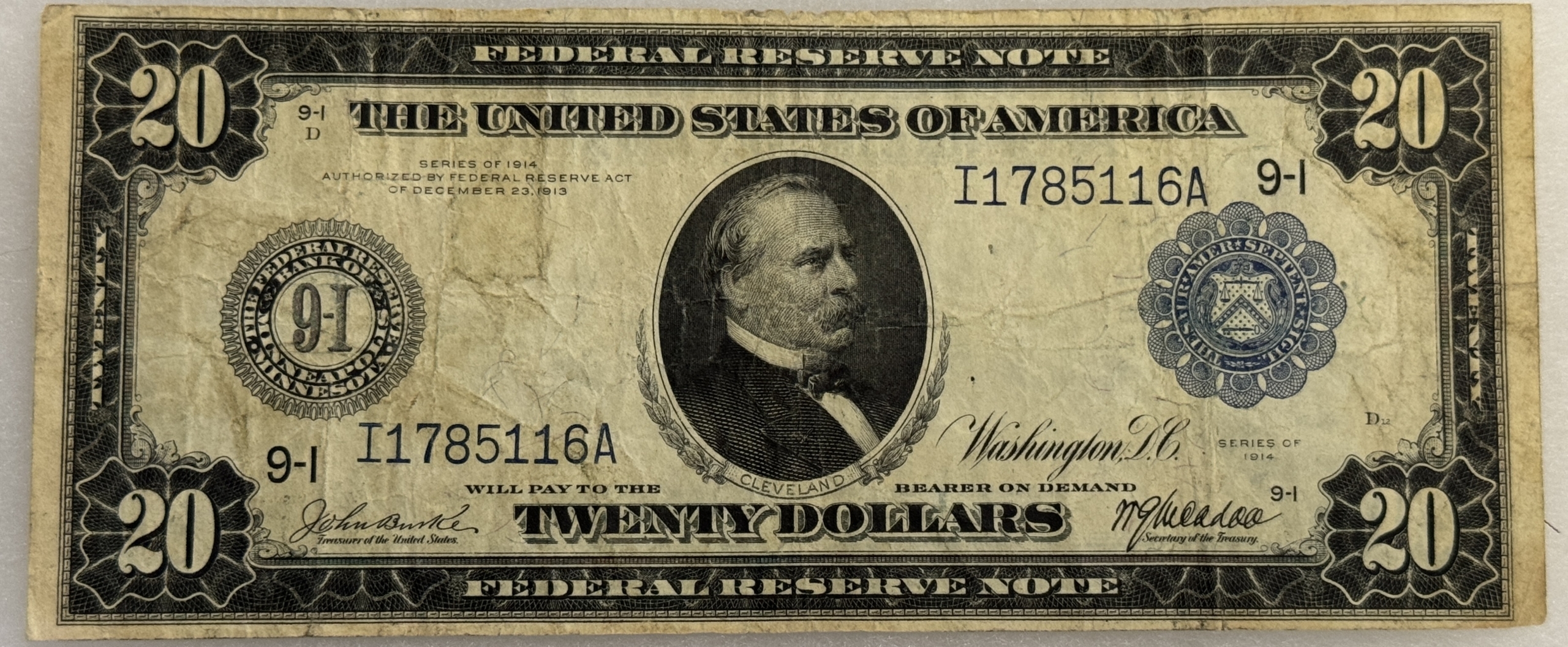 This is a 1914 $20 FEDERAL RESERVE NOTE, FR-996 – ORIGINAL FINE/VERY FINE! Our commitment is to provide you with quality coins and collectibles at the best possible prices. This piece is no exception. Please note, the coin and collectibles markets do fluctuate, and prices occasionally will change. In this rare circumstance, we will contact you first to verify your order.