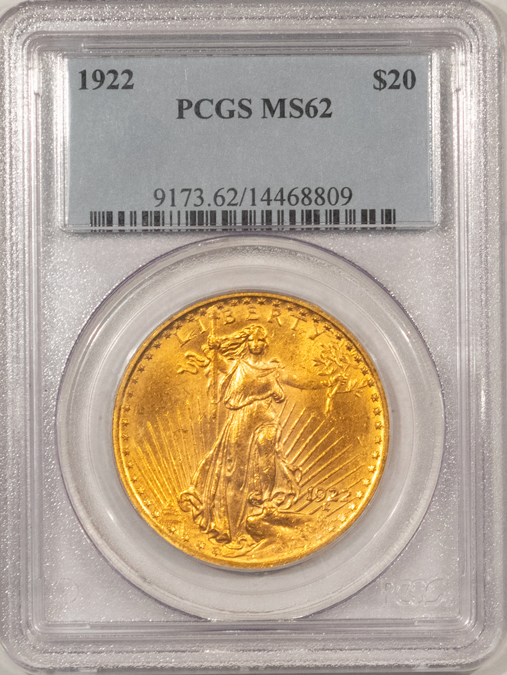 This is a 1922 $20 ST GAUDENS GOLD DOUBLE EAGLE – PCGS MS-62. Our commitment is to provide you with quality coins and collectibles at the best possible prices. This piece is no exception. Please note, the coin and collectibles markets do fluctuate, and prices occasionally will change. In this rare circumstance, we will contact you first to verify your order.