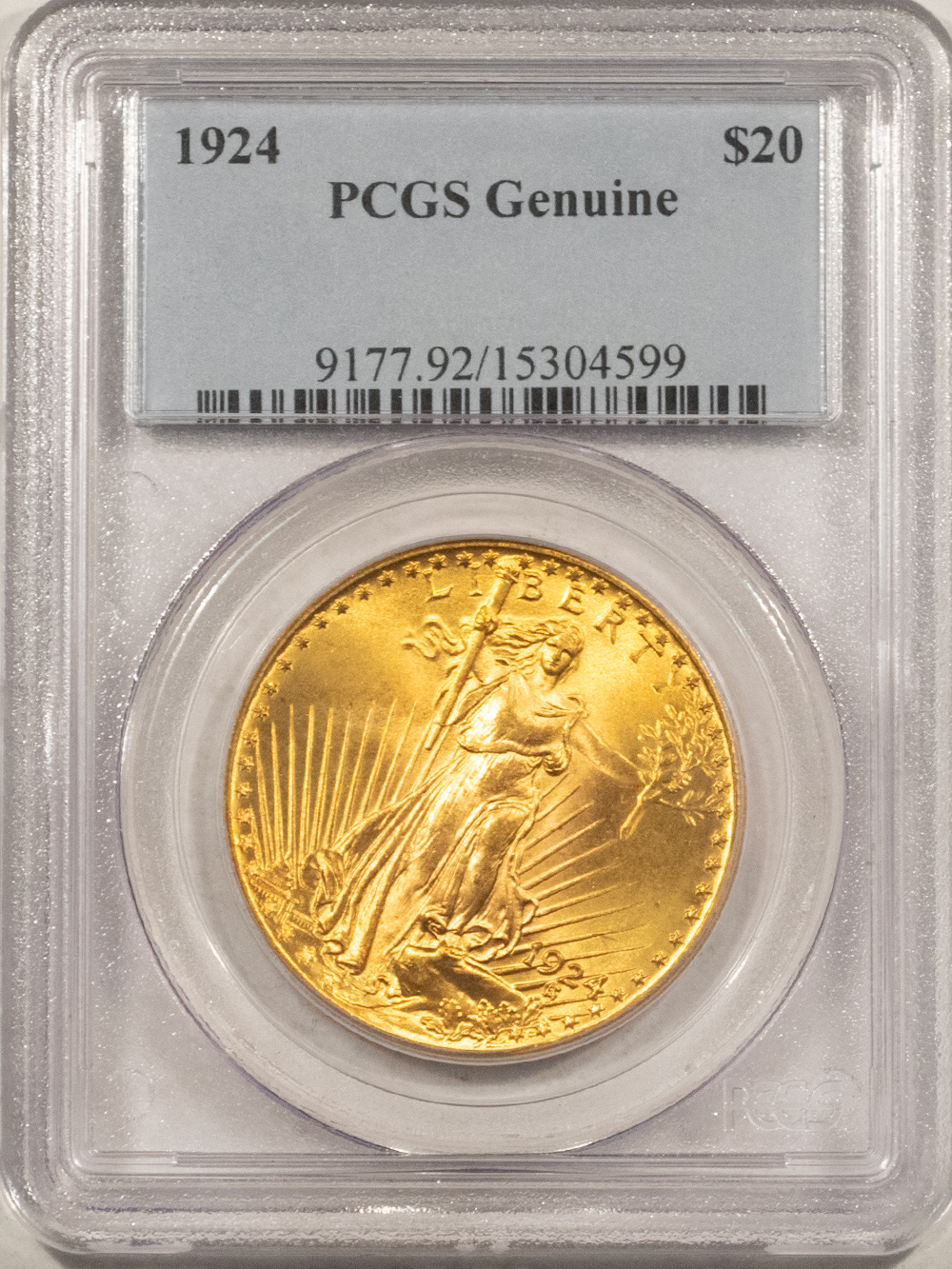 This is a 1924 $20 ST GAUDENS GOLD DOUBLE EAGLE – PCGS GENUINE, LOOKS GEM! Our commitment is to provide you with quality coins and collectibles at the best possible prices. This piece is no exception. Please note, the coin and collectibles markets do fluctuate, and prices occasionally will change. In this rare circumstance, we will contact you first to verify your order.