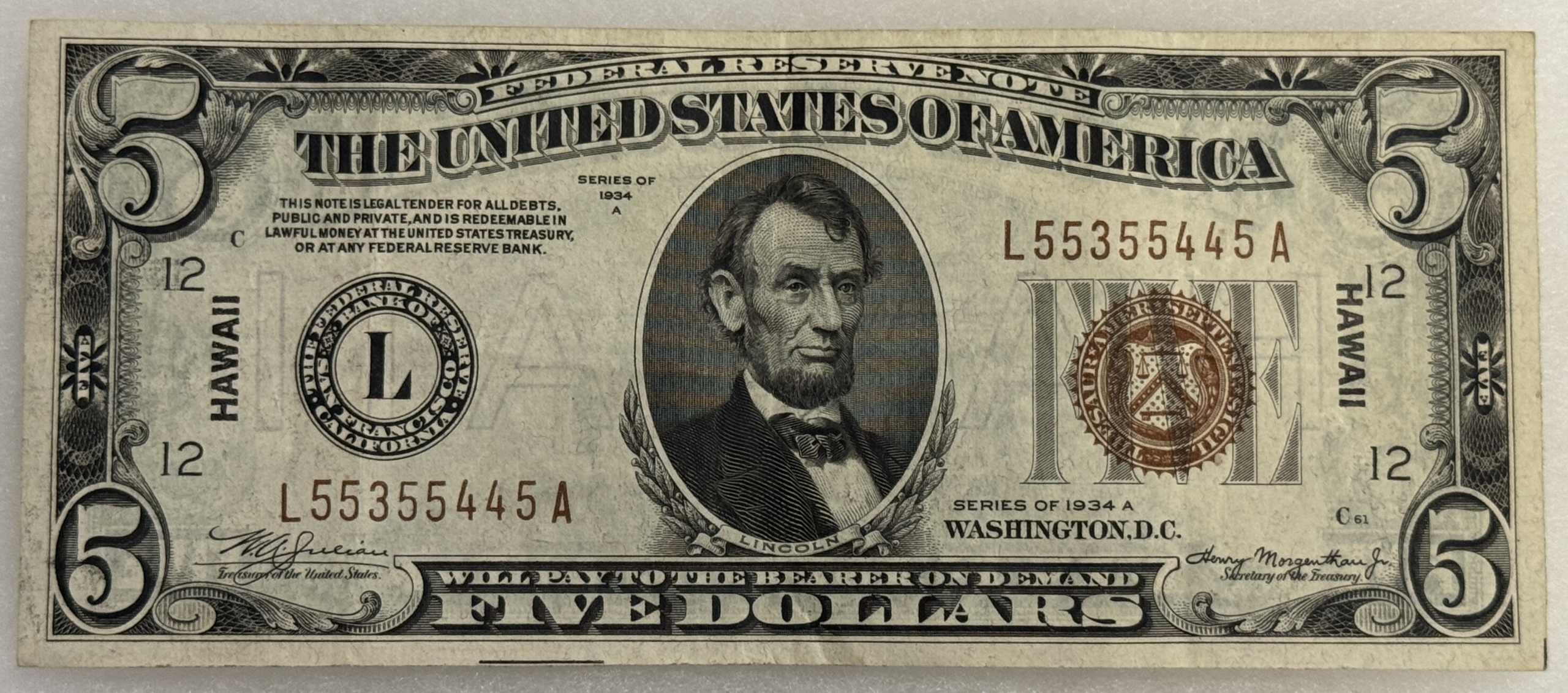 This is a 1934A $5 HAWAII FEDERAL RESERVE NOTE, FR-2302 – VIRTUALLY XF MINOR REVERSE SPOTS! Our commitment is to provide you with quality coins and collectibles at the best possible prices. This piece is no exception. Please note, the coin and collectibles markets do fluctuate, and prices occasionally will change. In this rare circumstance, we will contact you first to verify your order.