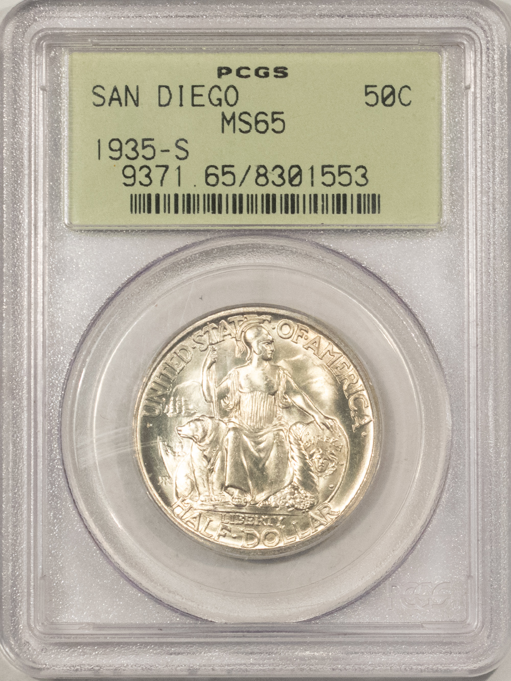 This is a 1935-S SAN DIEGO COMMEMORATIVE HALF DOLLAR – PCGS MS-65, OLD GREEN HOLDER & PREMIUM QUALITY! Our commitment is to provide you with quality coins and collectibles at the best possible prices. This piece is no exception. Please note, the coin and collectibles markets do fluctuate, and prices occasionally will change. In this rare circumstance, we will contact you first to verify your order.