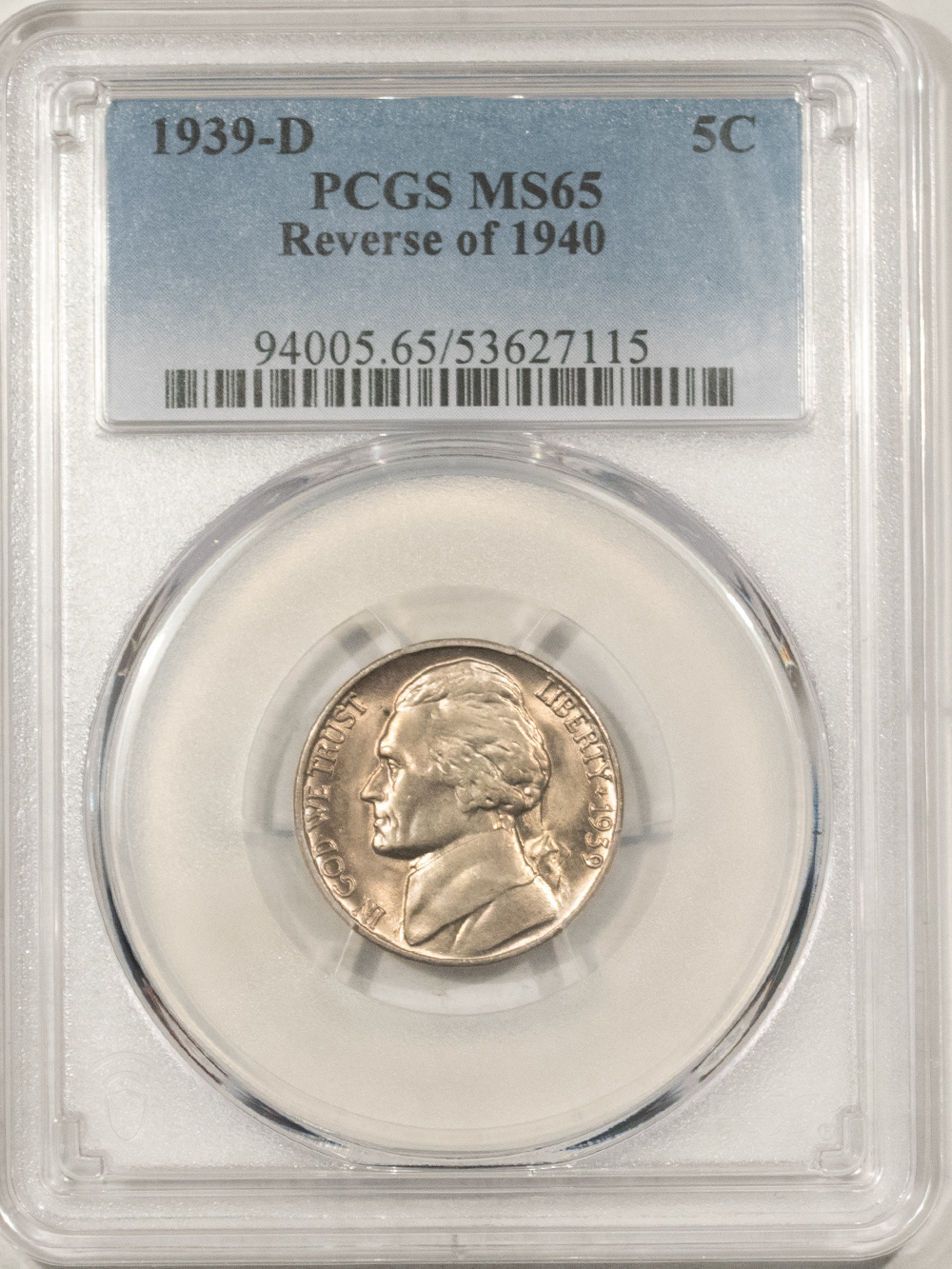 This is a 1939-D JEFFERSON NICKEL, REVERSE OF 1940 – PCGS MS-65, PRETTY GEM! Our commitment is to provide you with quality coins and collectibles at the best possible prices. This piece is no exception. Please note, the coin and collectibles markets do fluctuate, and prices occasionally will change. In this rare circumstance, we will contact you first to verify your order.