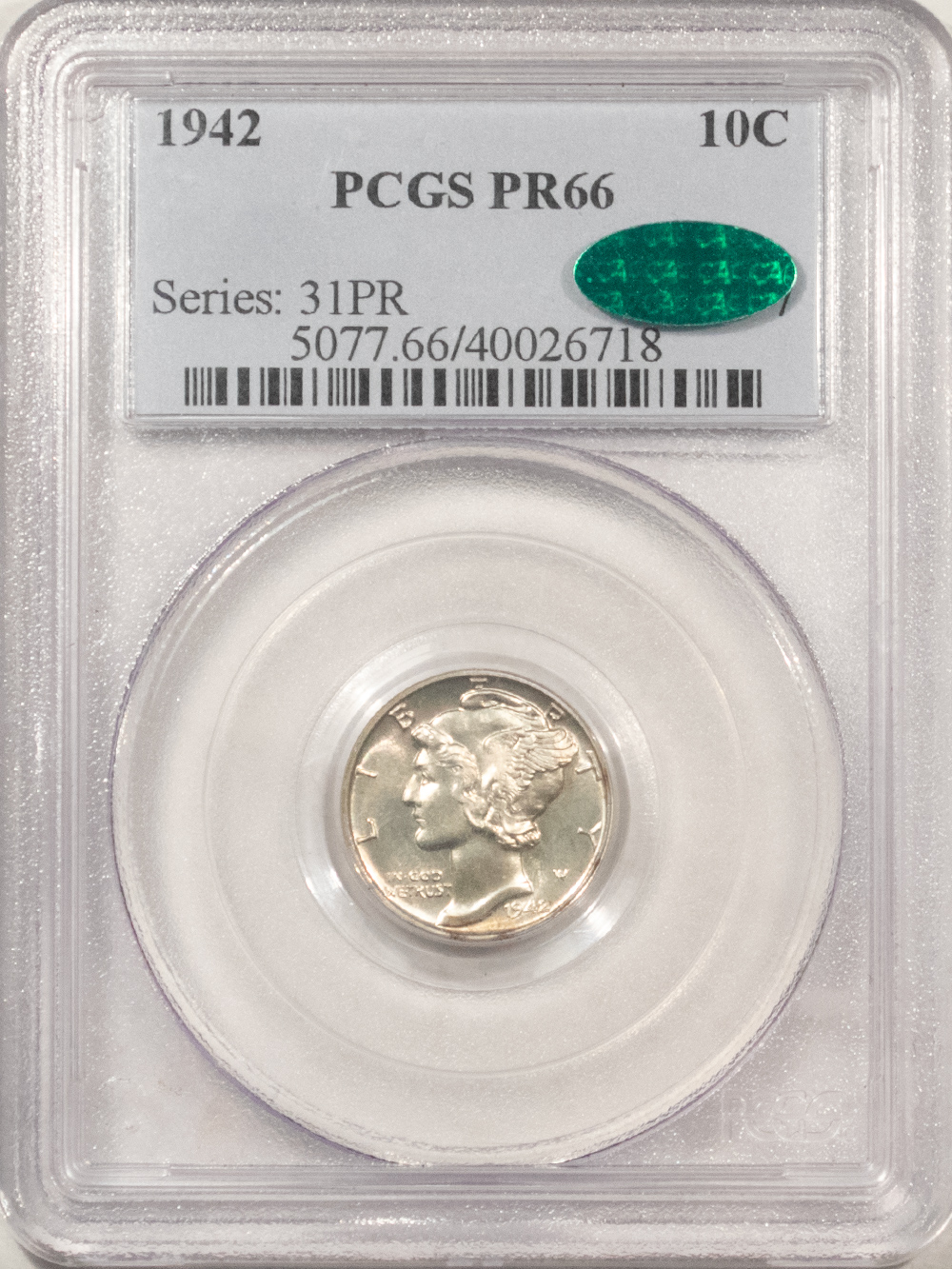 This is a 1942 PROOF MERCURY DIME – PCGS PR-66, 67 QUALITY! PREMIUM QUALITY! CAC APPROVED! Our commitment is to provide you with quality coins and collectibles at the best possible prices. This piece is no exception. Please note, the coin and collectibles markets do fluctuate, and prices occasionally will change. In this rare circumstance, we will contact you first to verify your order.