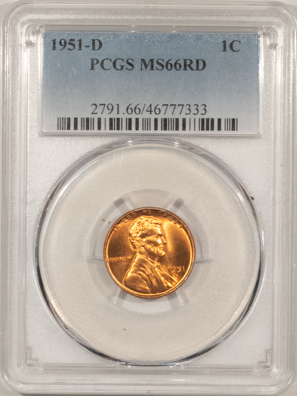 This is a 1951-D LINCOLN CENT – PCGS MS-66 RD, BLAZING & PREMIUM QUALITY! Our commitment is to provide you with quality coins and collectibles at the best possible prices. This piece is no exception. Please note, the coin and collectibles markets do fluctuate, and prices occasionally will change. In this rare circumstance, we will contact you first to verify your order.