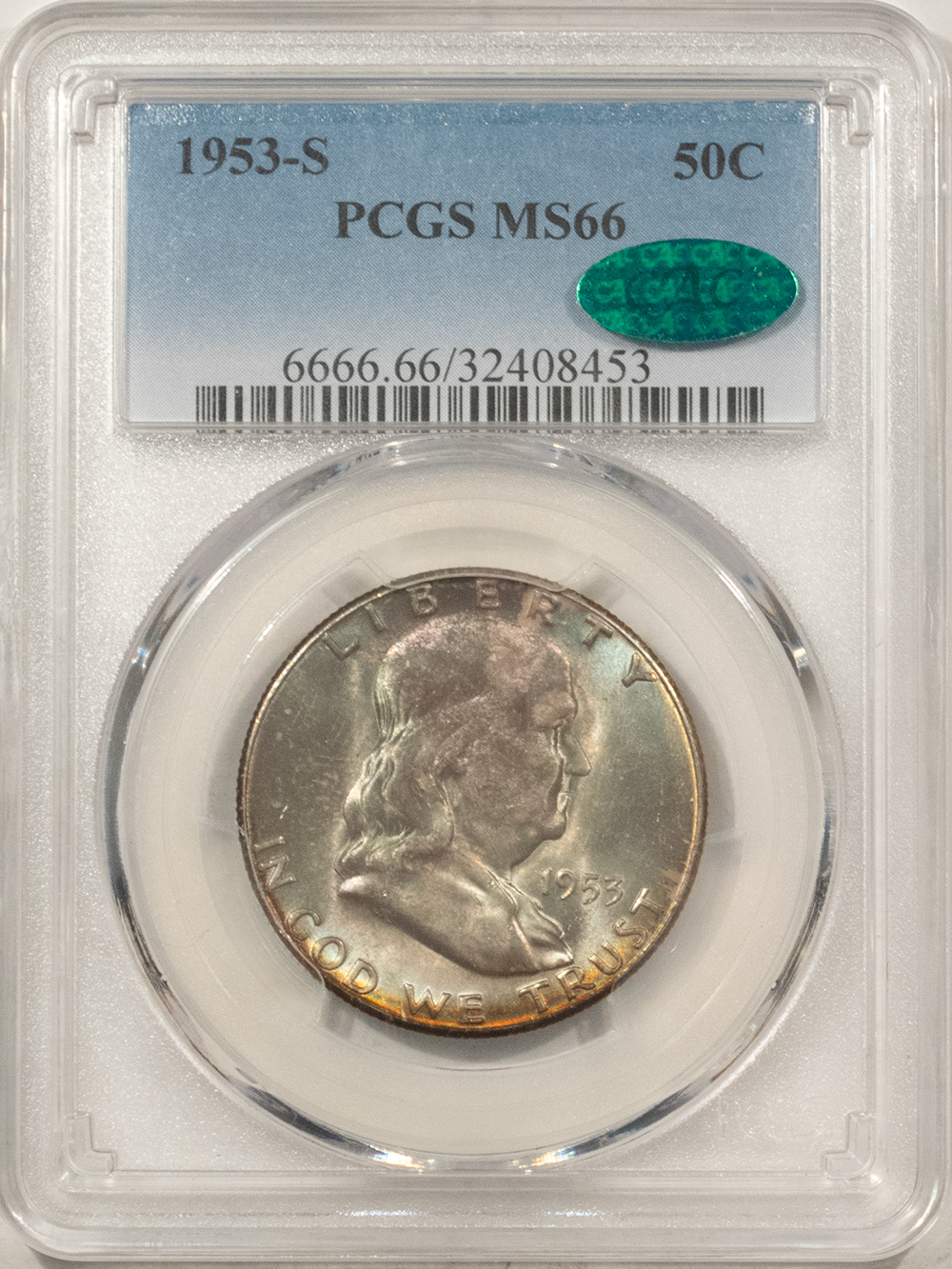 This is a 1953-S FRANKLIN HALF DOLLAR – PCGS MS-66, PRETTY MINT SET TONING, PREMIUM QUALITY & CAC APPROVED! Our commitment is to provide you with quality coins and collectibles at the best possible prices. This piece is no exception. Please note, the coin and collectibles markets do fluctuate, and prices occasionally will change. In this rare circumstance, we will contact you first to verify your order.