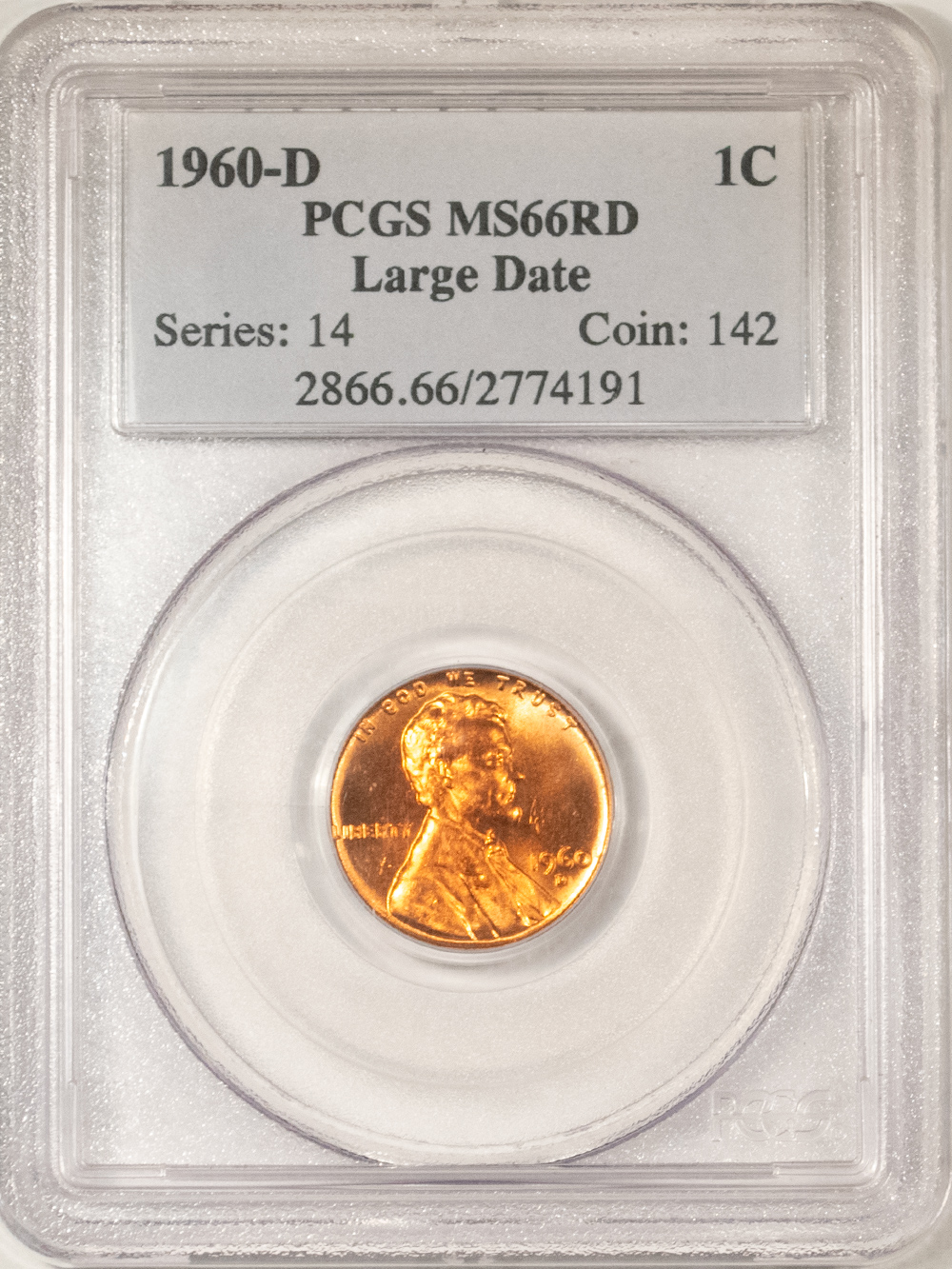 This is a 1960-D LINCOLN CENT, LARGE DATE – PCGS MS-66 RD. Our commitment is to provide you with quality coins and collectibles at the best possible prices. This piece is no exception. Please note, the coin and collectibles markets do fluctuate, and prices occasionally will change. In this rare circumstance, we will contact you first to verify your order.