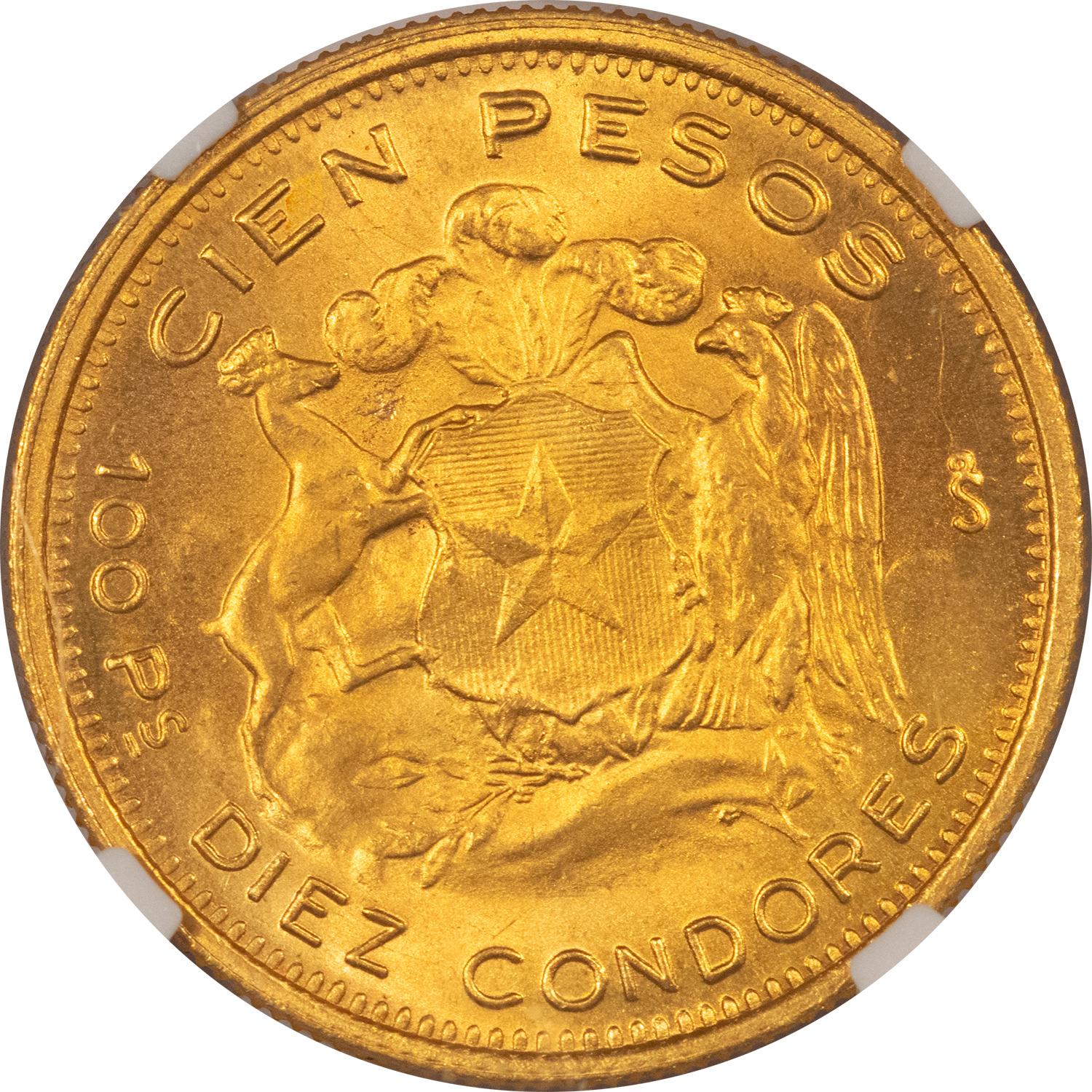 This is a 1960 SO CHILE GOLD 100 PESOS, KM #175 – NGC MS-65, SCARCER IN GEM! .5885 AGW. A pretty coin, struck in .900 Fine Gold, these are scarcer in Gem MS-65 condition. Our commitment is to provide you with quality coins and collectibles at the best possible prices. This piece is no exception. Please note, the coin and collectibles markets do fluctuate, and prices occasionally will change. In this rare circumstance, we will contact you first to verify your order.