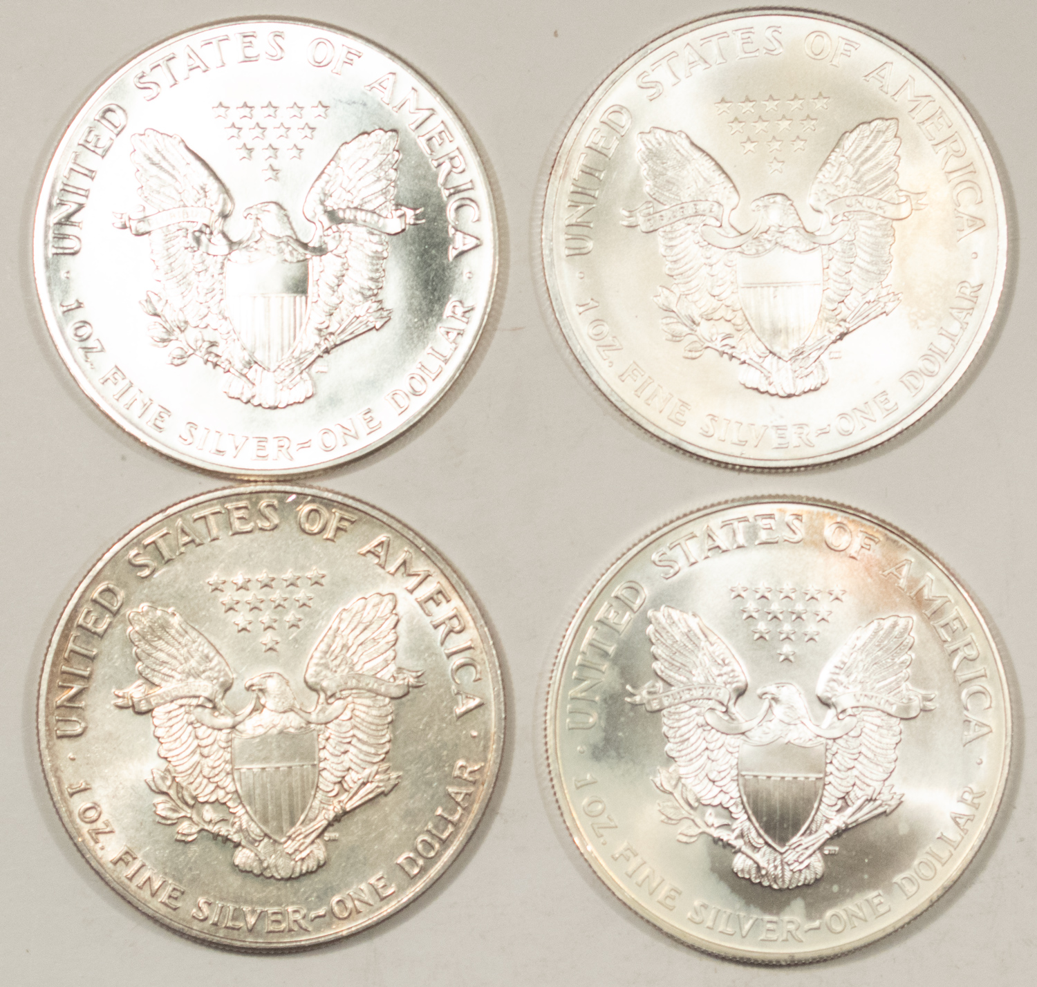 This is a 1987 1990 1998 2003 $1 AMERICAN SILVER EAGLES, LOT/4, 1 OZ .999 – UNCIRCULATED! ALL WITH IMPAIRMENTS/SPOTS! Our commitment is to provide you with quality coins and collectibles at the best possible prices. This piece is no exception. Please note, the coin and collectibles markets do fluctuate, and prices occasionally will change. In this rare circumstance, we will contact you first to verify your order.