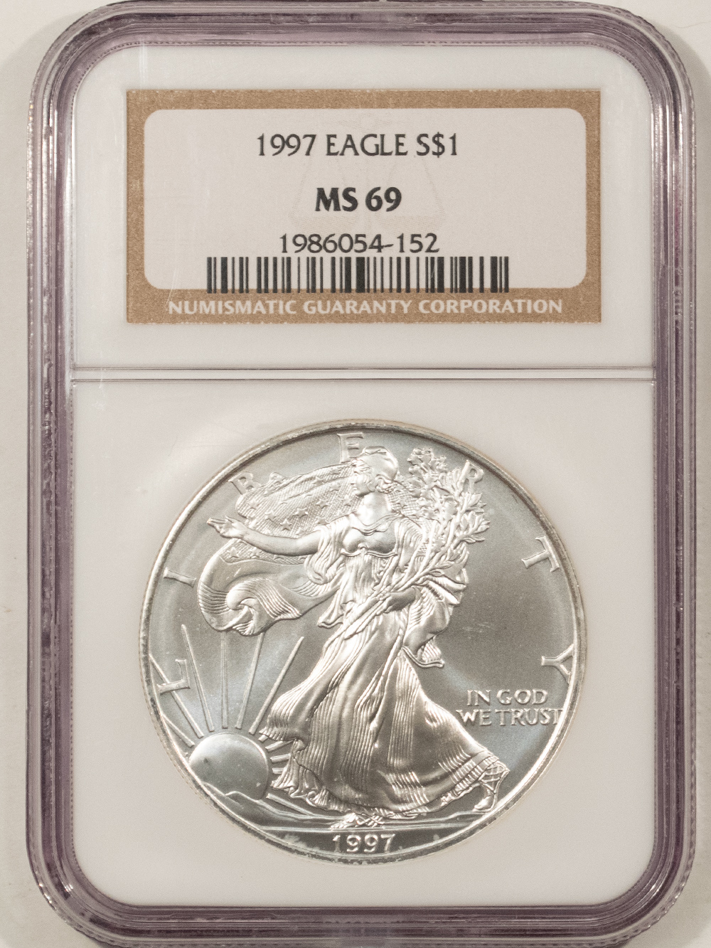 This is a 1997 $1 AMERICAN SILVER EAGLE, 1 OZ .999 – NGC MS-69. Our commitment is to provide you with quality coins and collectibles at the best possible prices. This piece is no exception. Please note, the coin and collectibles markets do fluctuate, and prices occasionally will change. In this rare circumstance, we will contact you first to verify your order.
