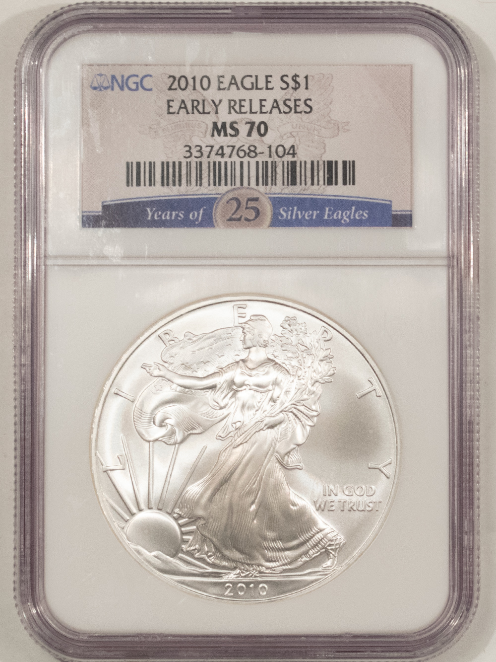 This is a 2010 $1 AMERICAN SILVER EAGLE, 1 OZ .999 – NGC MS-70, EARLY RELEASES! Our commitment is to provide you with quality coins and collectibles at the best possible prices. This piece is no exception. Please note, the coin and collectibles markets do fluctuate, and prices occasionally will change. In this rare circumstance, we will contact you first to verify your order.