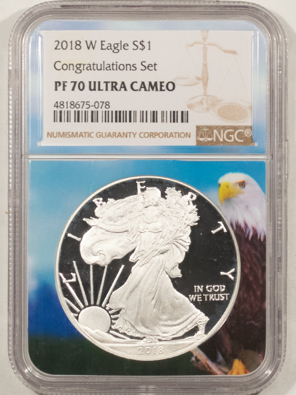 This is a 2018-W $1 PROOF AMERICAN SILVER EAGLE 1 OZ, NGC PF-70 ULTRA CAMEO, CONGRATS SET! Our commitment is to provide you with quality coins and collectibles at the best possible prices. This piece is no exception. Please note, the coin and collectibles markets do fluctuate, and prices occasionally will change. In this rare circumstance, we will contact you first to verify your order.