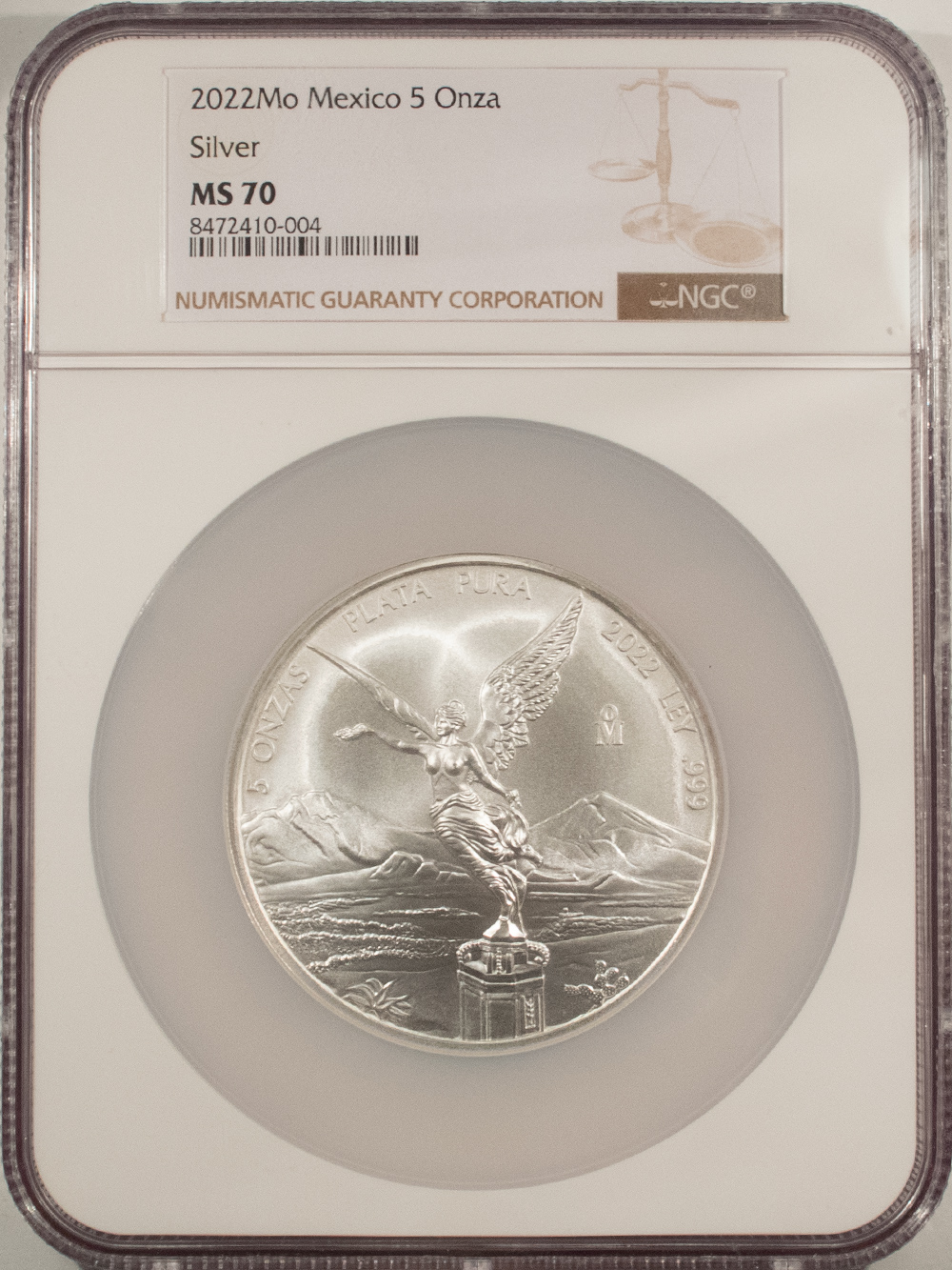 This is a 2022MO MEXICO 5 OZ SILVER LIBERTAD – NGC MS-70. Our commitment is to provide you with quality coins and collectibles at the best possible prices. This piece is no exception. Please note, the coin and collectibles markets do fluctuate, and prices occasionally will change. In this rare circumstance, we will contact you first to verify your order.