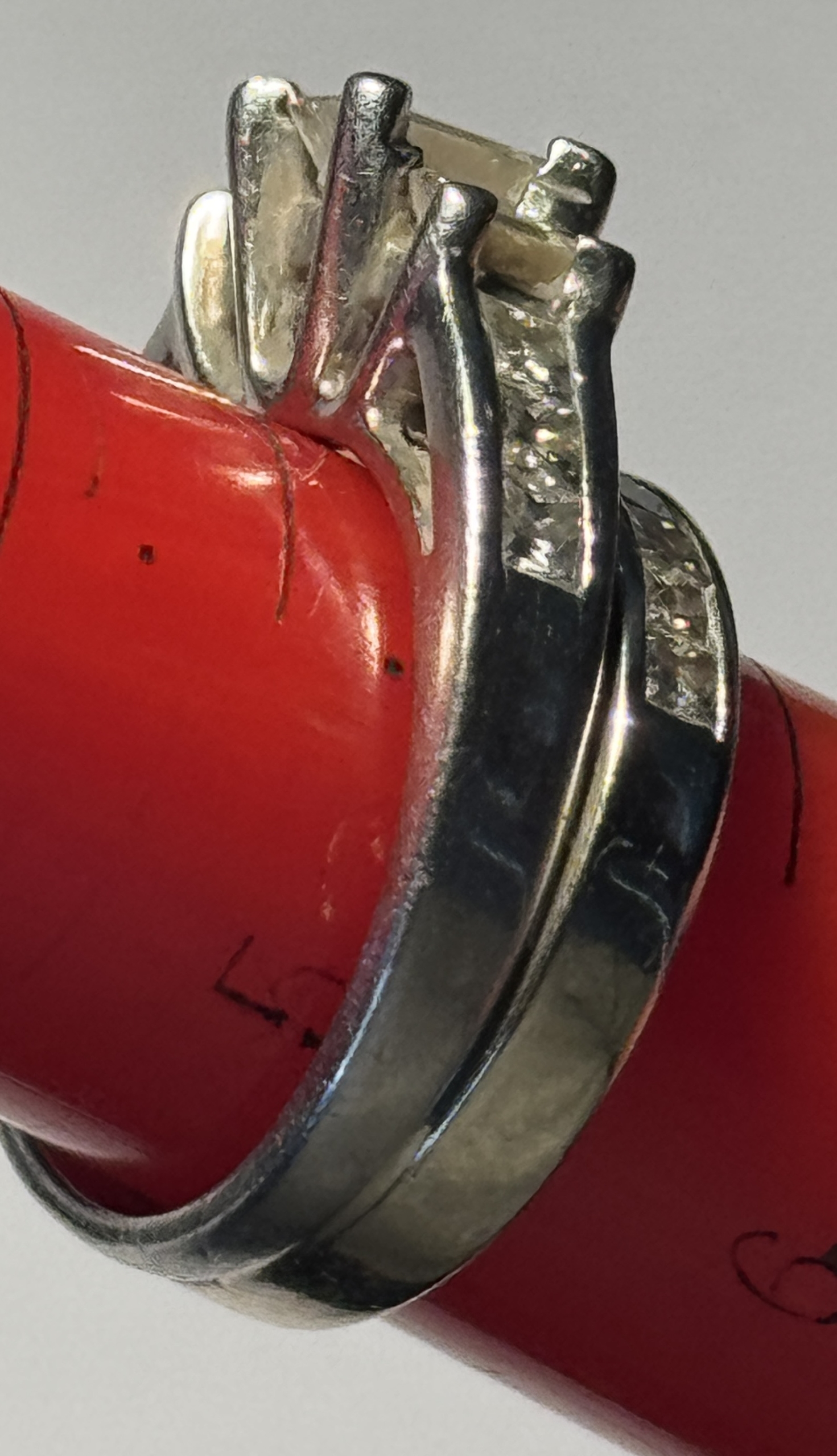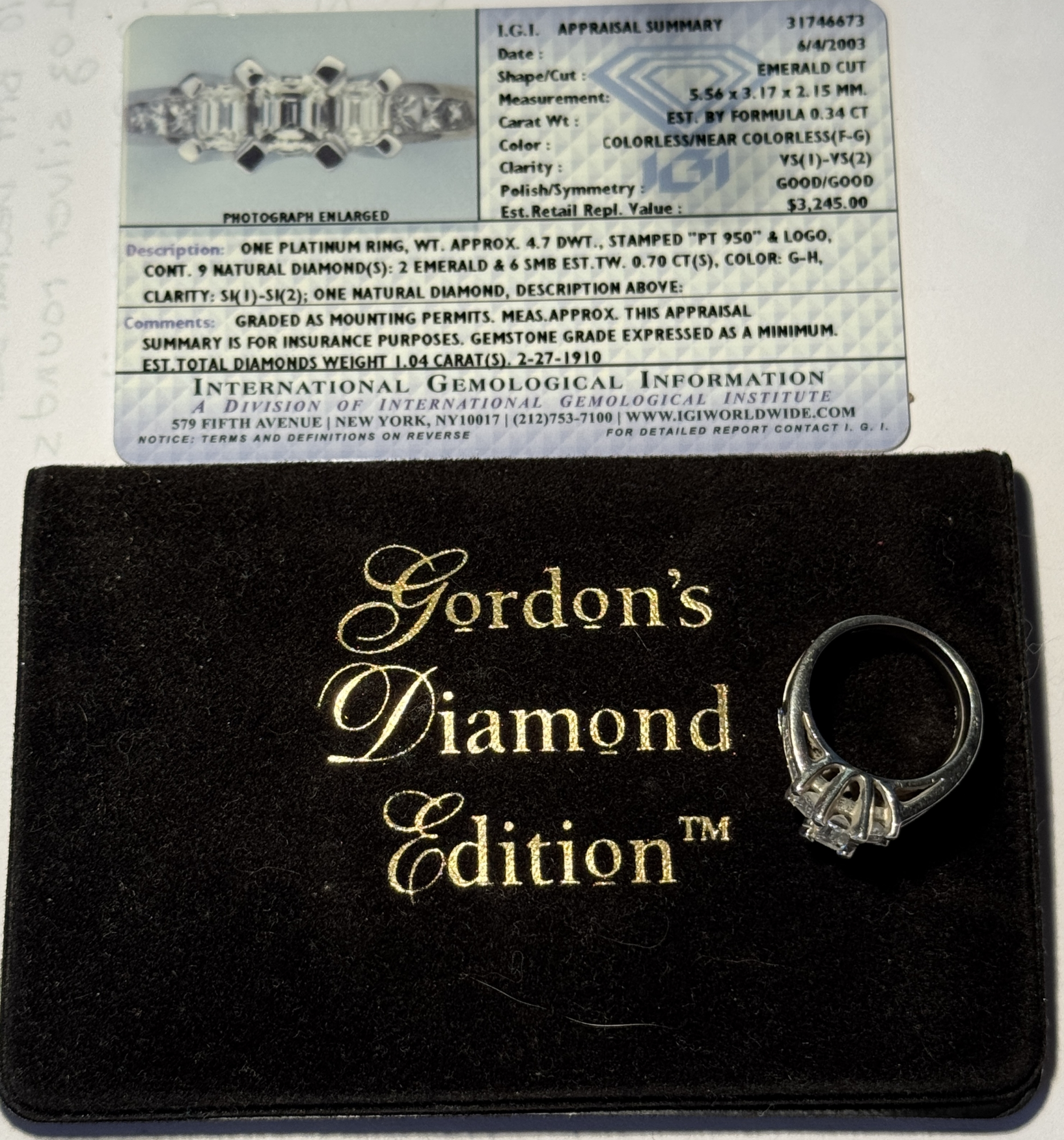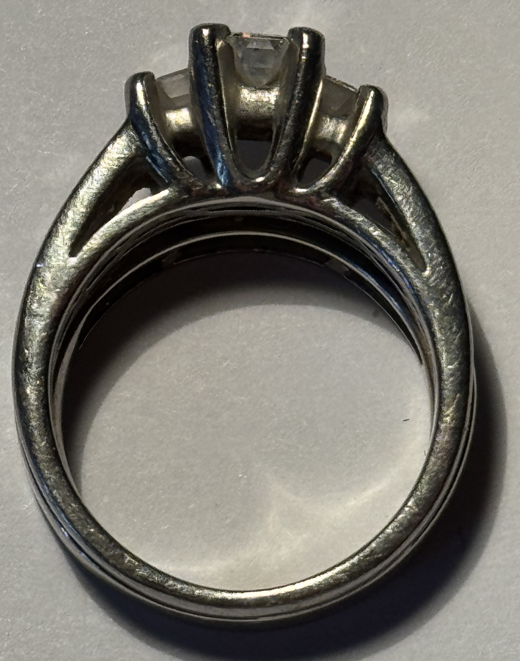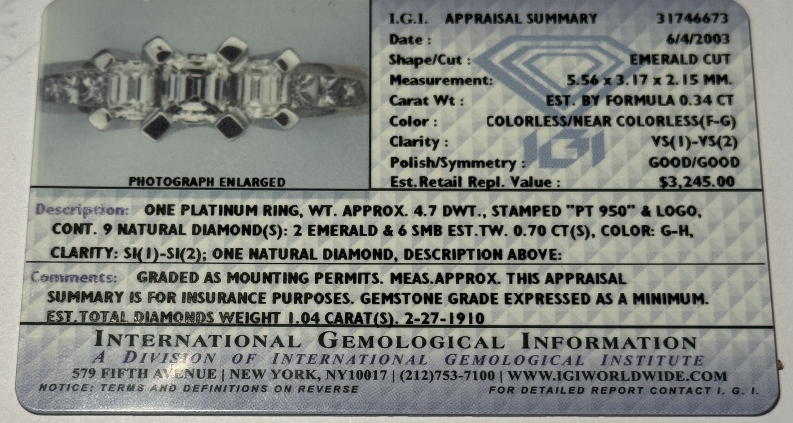 This is a 6.2 DWT PLATINUM/GOLD ENGAGEMENT/WEDDING RING .34CT CENTER DIAMOND + 19 DIAMONDS! This is an engagement/wedding set, sized 5.5. The set weighs 6.2 pennyweights, approximately 4.7 dwt for the platinum engagement ring and 1.5 dwt for the 14kt white gold wedding band. Center stone is approximately .34 carat princess cut, VS2, F/G color. There are also 2 other emerald cut diamonds and 6 smaller princess cut diamonds on the engagement band. The wedding band is 1.5 dwt of 14 kt white gold and has 11 small princess cut diamonds. An attractive, affordable ring. Diamonds shows no apparent black and faces up nicely. This ring was sold for over $2,000 and comes with an appraisal card that had an estimated value of $3,245…..although we don’t take much stock in the card other than for the general information. Priced to sell. Our commitment is to provide you with quality coins and collectibles at the best possible prices. This piece is no exception. Please note, the coin and collectibles markets do fluctuate, and prices occasionally will change. In this rare circumstance, we will contact you first to verify your order.