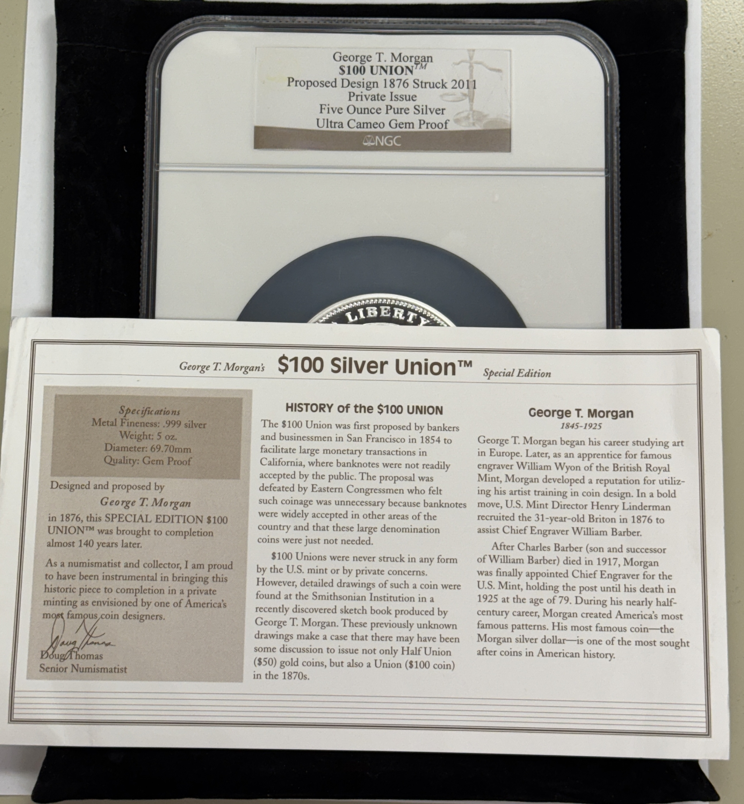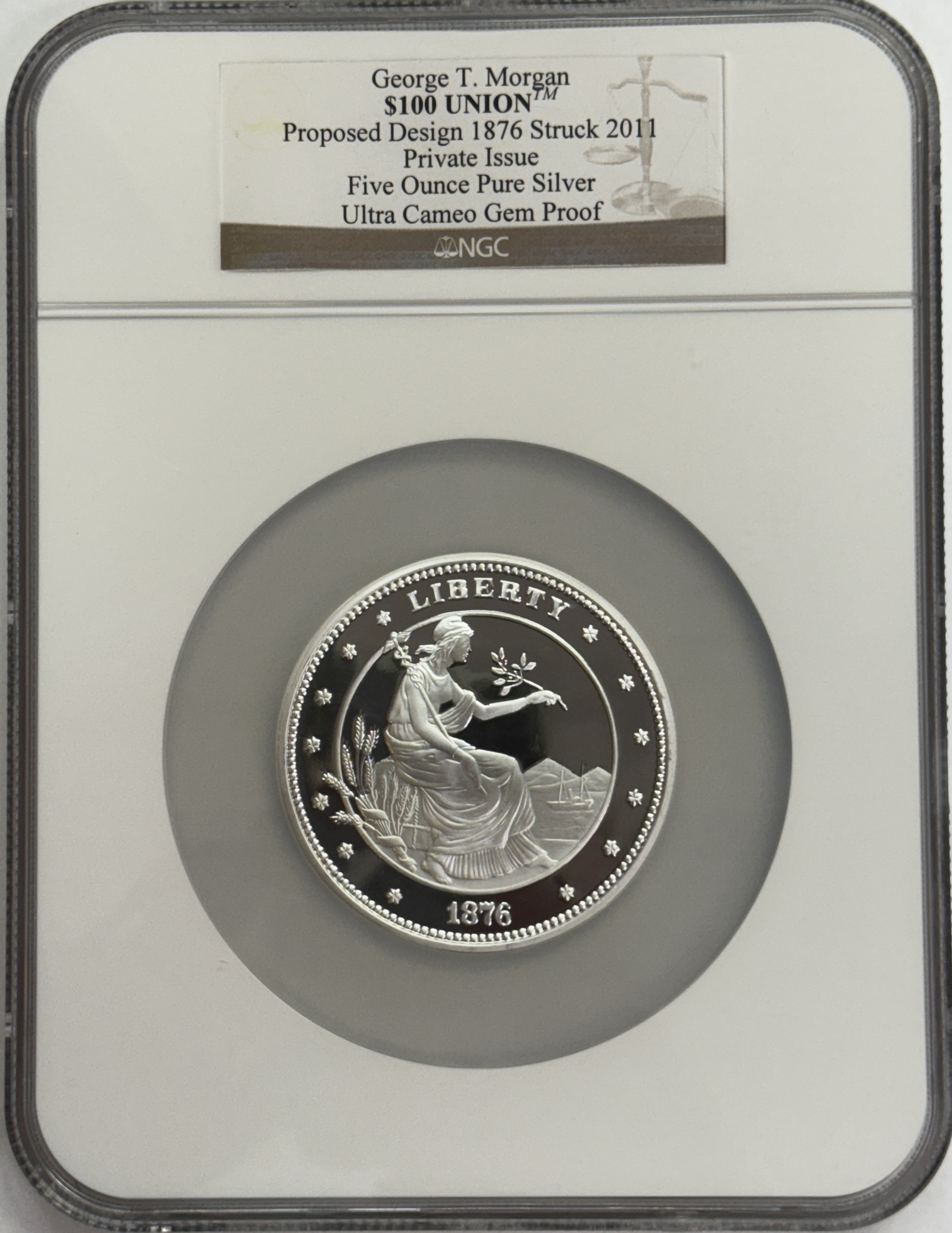 This is a GEORGE T. MORGAN $100 UNION 1876 PROPOSED DESIGN 5 OZ .999 FINE SILVER PRIVATE ISSUE PROOF – NGC GEM PROOF ULTRA CAMEO! A nice 5 oz .999 Silver Private Issue, distributed by the Smithsonian Institution. Comes with original COA & Smithsonian Bag. Our commitment is to provide you with quality coins and collectibles at the best possible prices. This piece is no exception. Please note, the coin and collectibles markets do fluctuate, and prices occasionally will change. In this rare circumstance, we will contact you first to verify your order.