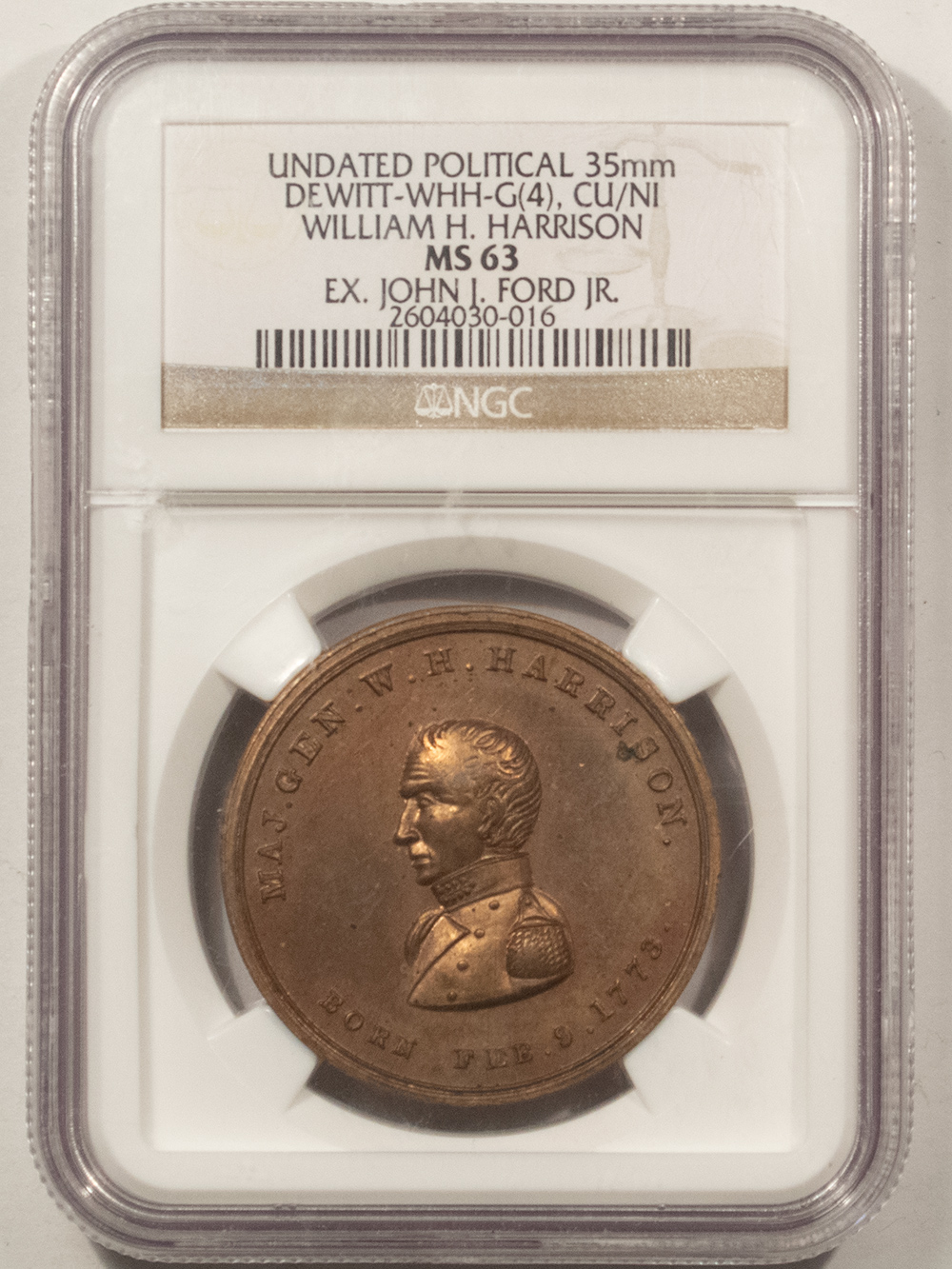 This is a RARE ca 1840 WILLIAM HARRISON POLITICAL MEDAL, 35mm, DEWITT WHH-G(4); NGC MS-63! THIS MEDAL IS KNOWN WITH SEVERAL DIFFERENT REVERSES. THIS IS UNIFACE AND THE FIRST THAT WE HAVE EVER SEEN. THIS EXAMPLE PEDIGREES TO THE JOHN J. FORD COLLECTION. Our commitment is to provide you with quality coins and collectibles at the best possible prices. This piece is no exception. Please note, the coin and collectibles markets do fluctuate, and prices occasionally will change. In this rare circumstance, we will contact you first to verify your order.