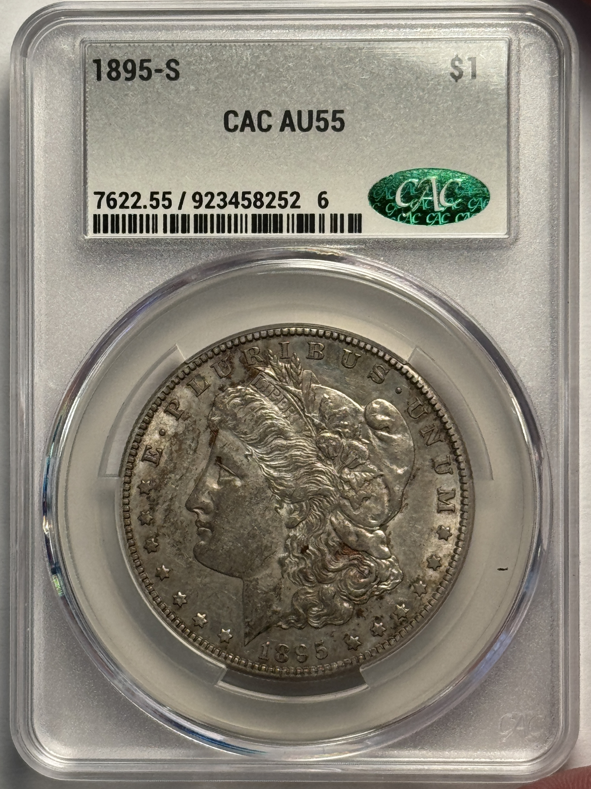 This is a SCARCE 1895-S MORGAN DOLLAR, CACGS AU-55, VERY CHOICE AU & A SEMI-KEY DATE! Our commitment is to provide you with quality coins and collectibles at the best possible prices. This piece is no exception. Please note, the coin and collectibles markets do fluctuate, and prices occasionally will change. In this rare circumstance, we will contact you first to verify your order.