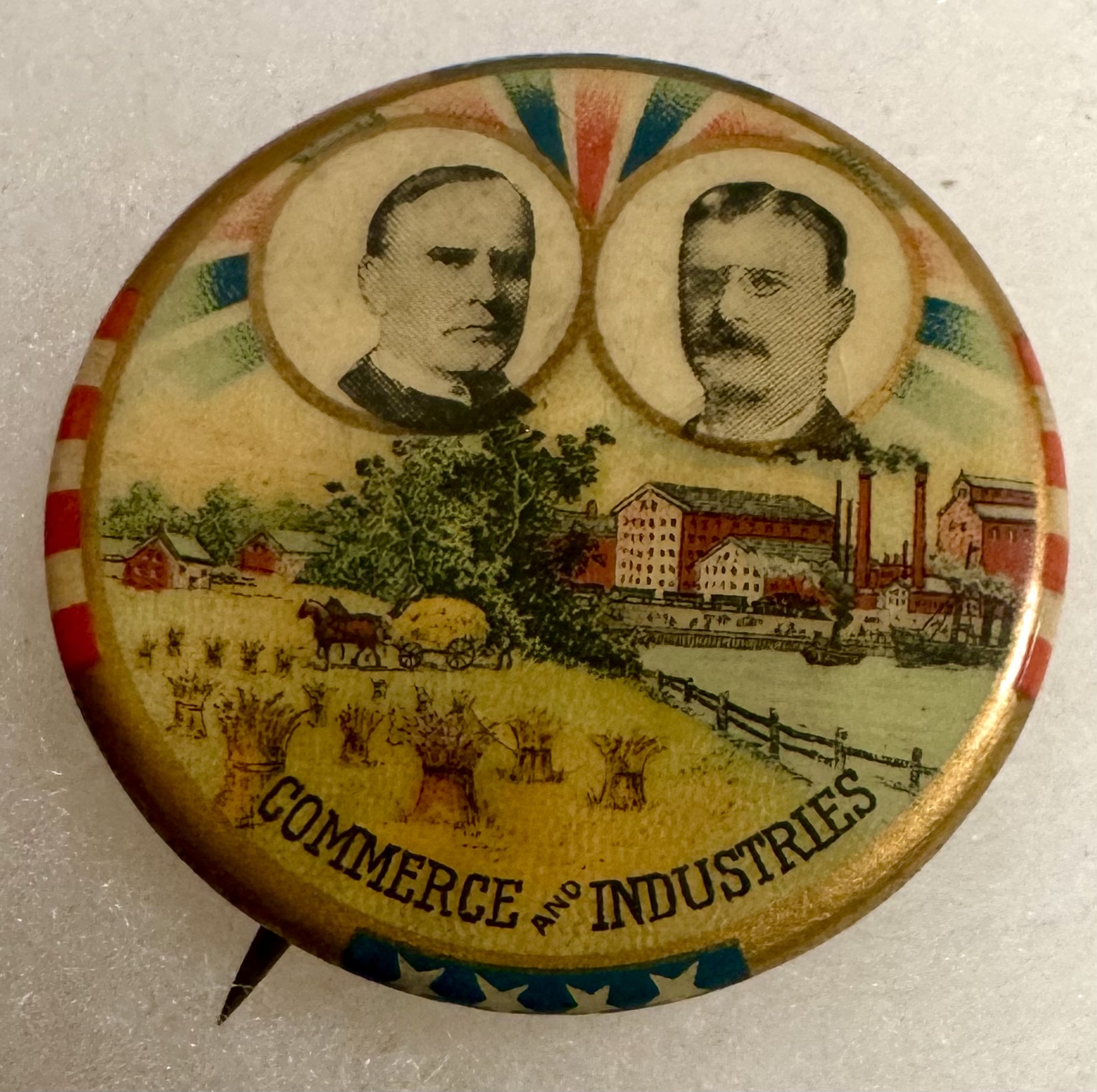 This is a SCARCE 1900 WILLIAM McKINLEY CAMPAIGN BUTTON PAIR-1 1/4″, COLORFUL & GRAPHIC-EXC. THE FIRST IS A McKINLEY-ROOSEVELT JUGATE AND READS “COMMERCE AND INDUSTRIES” W/ A FARM SCENE, FACTORY AND A RAILROAD. THE SECOND IS CONSIDERED THE “MATE” BUTTON TO THE JUGATE, FEATURES JUST McKINLEY, AND READS “McKINLEY AND PROSPERITY” AND ALSO PICTURES THE SAME FARM SCENE WITH A FACTORY TO THE RIGHT. ON THIS BUTTON, McKINLEY’S PORTRAIT IS SET AGAINST A SUNBURST. WHAT LOOKS LIKE A FLAW ON McKINLEY’S CHEEK IS SIMPLY A SHADED AREA IN THE ORIGINAL PRINTING, AND ALL KNOWN EXAMPLES OF THIS BUTTON ARE SIMILAR IN THAT REGARD. 1900 REALLY MARKED THE GOLDEN AGE OF CELLULOID BUTTONS, AND THESE ARE TWO OF THE MOST COLORFUL AND GRAPHIC EXAMPLES ILLUSTRATING THAT ERA. Our commitment is to provide you with quality coins and collectibles at the best possible prices. This piece is no exception. Please note, the coin and collectibles markets do fluctuate, and prices occasionally will change. In this rare circumstance, we will contact you first to verify your order.
